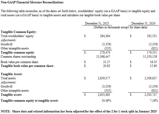 Book value per share grew $4.92, or 30.1%, from $16.35 at December 31, 2024 to $21.27 at December 31, 2025. Tangible book value per share increased $5.03, or 31.8%, from $15.80 at December 31, 2024 to $20.83 at December 31, 2025 (see “Non-GAAP Financial Measure Reconciliation” below for additional detail).  These increases were due to earnings growth during the twelve months ended December 31, 2025 and a reduction of unrealized losses in the available for sale securities (“AFS”) portfolio coupled with net proceeds of approximately $43 million from completion of a follow-on common stock offering during the second quarter of 2025.