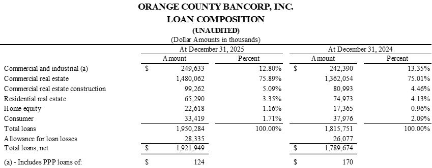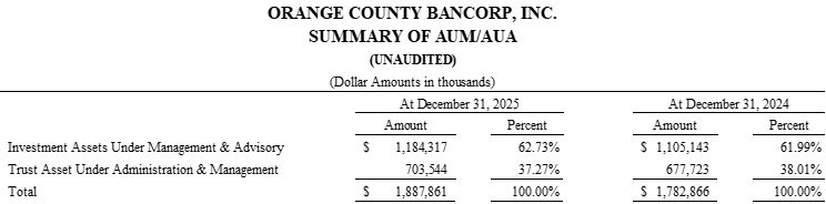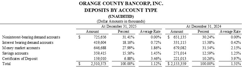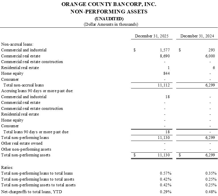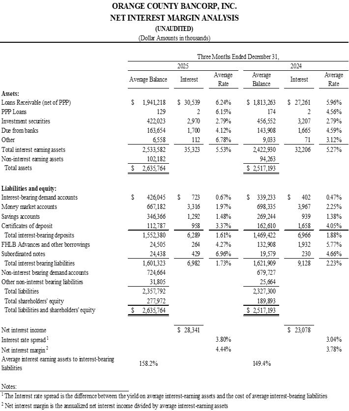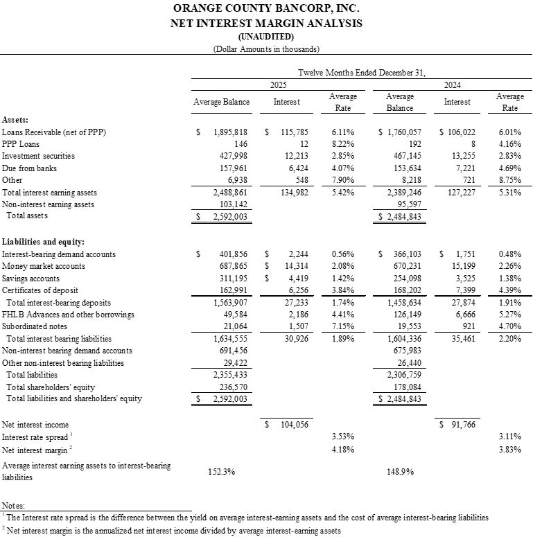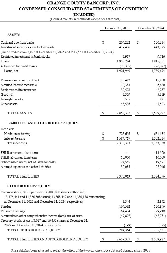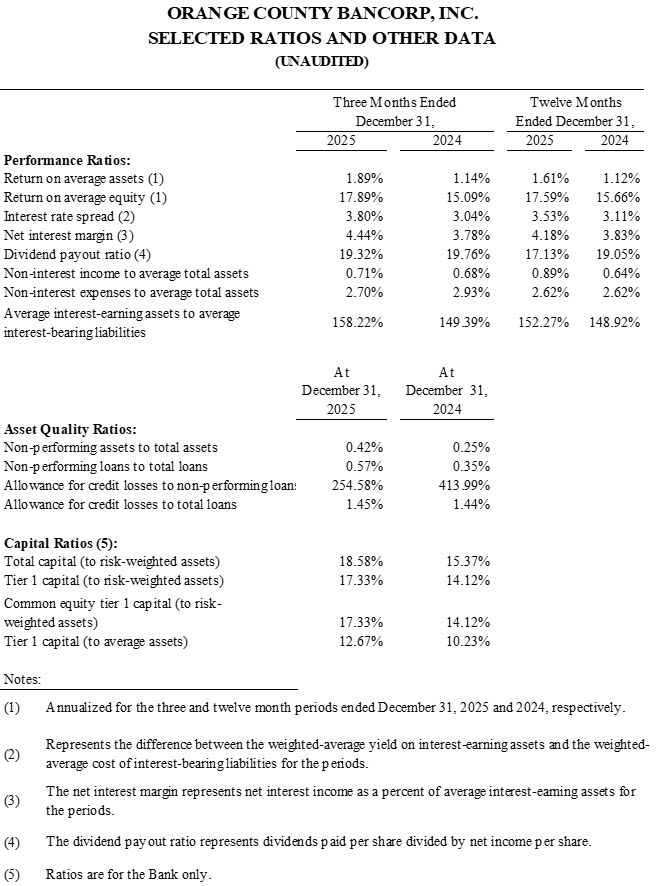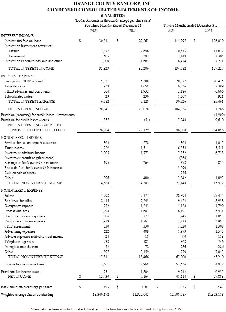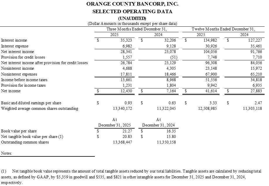 MIDDLETOWN, N.Y., February 4, 2026 – Orange County Bancorp, Inc. (the “Company” - Nasdaq: OBT), parent company of Orange Bank & Trust Co. (the “Bank”) and Orange Investment Advisors, Inc. (“OIA”), today announced net income of $12.4 million, or $0.93 per basic and diluted share, for the three months ended December 31, 2025.  This compares with net income of $7.2 million, or $0.63 per basic and diluted share, for the three months ended December 31, 2024.  The increase in earnings per share, basic and diluted, was due primarily to increases in net interest income and total noninterest income as well as a reduction in noninterest expense offset by an increase in provision for credit losses during the current period.  For the twelve months ended December 31, 2025, net income was $41.6 million, or $3.33 per basic and diluted share, as compared to $27.9 million, or $2.47 per basic and diluted share, for the twelve months ended December 31, 2024.