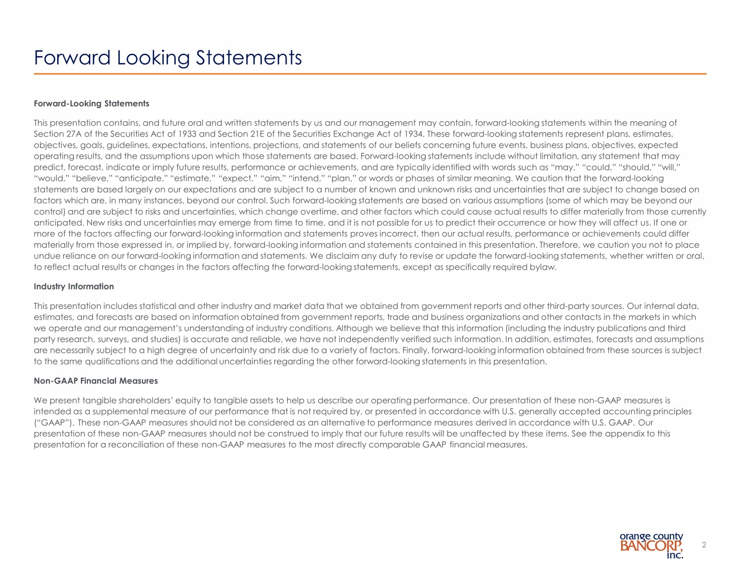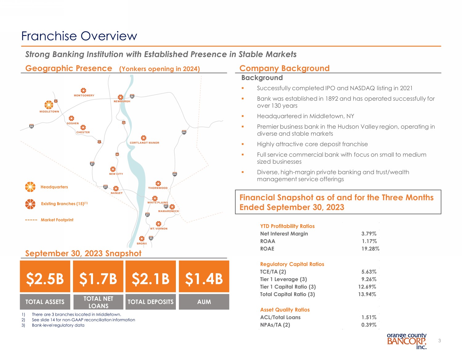 Forward Looking Statements 2 Forward - Looking Statements This presentation contains, and future oral and written statements by us and our management may contain, forward - looking stateme nts within the meaning of Section 27A of the Securities Act of 1933 and Section 21E of the Securities Exchange Act of 1934. These forward - looking statemen ts represent plans, estimates, objectives, goals, guidelines, expectations, intentions, projections, and statements of our beliefs concerning future events, bu siness plans, objectives, expected operating results, and the assumptions upon which those statements are based. Forward - looking statements include without limitat ion, any statement that may predict, forecast, indicate or imply future results, performance or achievements, and are typically identified with words suc h a s “may,” “could,” “should,” “will,” “would,” “believe,” “anticipate,” “estimate,” “expect,” “aim,” “intend,” “plan,” or words or phases of similar meaning. We ca uti on that the forward - looking statements are based largely on our expectations and are subject to a number of known and unknown risks and uncertainties tha t a re subject to change based on factors which are, in many instances, beyond our control. Such forward - looking statements are based on various assumptions (some of which may be beyond our control) and are subject to risks and uncertainties, which change overtime, and other factors which could cause actual result s t o differ materially from those currently anticipated. New risks and uncertainties may emerge from time to time, and it is not possible for us to predict their occurre nce or how they will affect us. If one or more of the factors affecting our forward - looking information and statements proves incorrect, then our actual results, performa nce or achievements could differ materially from those expressed in, or implied by, forward - looking information and statements contained in this presentation. Th erefore, we caution you not to place undue reliance on our forward - looking information and statements. We disclaim any duty to revise or update the forward - looking s tatements, whether written or oral, to reflect actual results or changes in the factors affecting the forward - looking statements, except as specifically required by law. Industry Information This presentation includes statistical and other industry and market data that we obtained from government reports and other thi rd - party sources. Our internal data, estimates, and forecasts are based on information obtained from government reports, trade and business organizations and othe r c ontacts in the markets in which we operate and our management’s understanding of industry conditions. Although we believe that this information (including th e i ndustry publications and third party research, surveys, and studies) is accurate and reliable, we have not independently verified such information. In addit ion , estimates, forecasts and assumptions are necessarily subject to a high degree of uncertainty and risk due to a variety of factors. Finally, forward - looking informati on obtained from these sources is subject to the same qualifications and the additional uncertainties regarding the other forward - looking statements in this presentation. Non - GAAP Financial Measures We present tangible shareholders’ equity to tangible assets to help us describe our operating performance. Our presentation o f t hese non - GAAP measures is intended as a supplemental measure of our performance that is not required by, or presented in accordance with U.S. generally ac cepted accounting principles (“GAAP”). These non - GAAP measures should not be considered as an alternative to performance measures derived in accordance with U.S. GAAP. Our presentation of these non - GAAP measures should not be construed to imply that our future results will be unaffected by these ite ms. See the appendix to this presentation for a reconciliation of these non - GAAP measures to the most directly comparable GAAP financial measures.