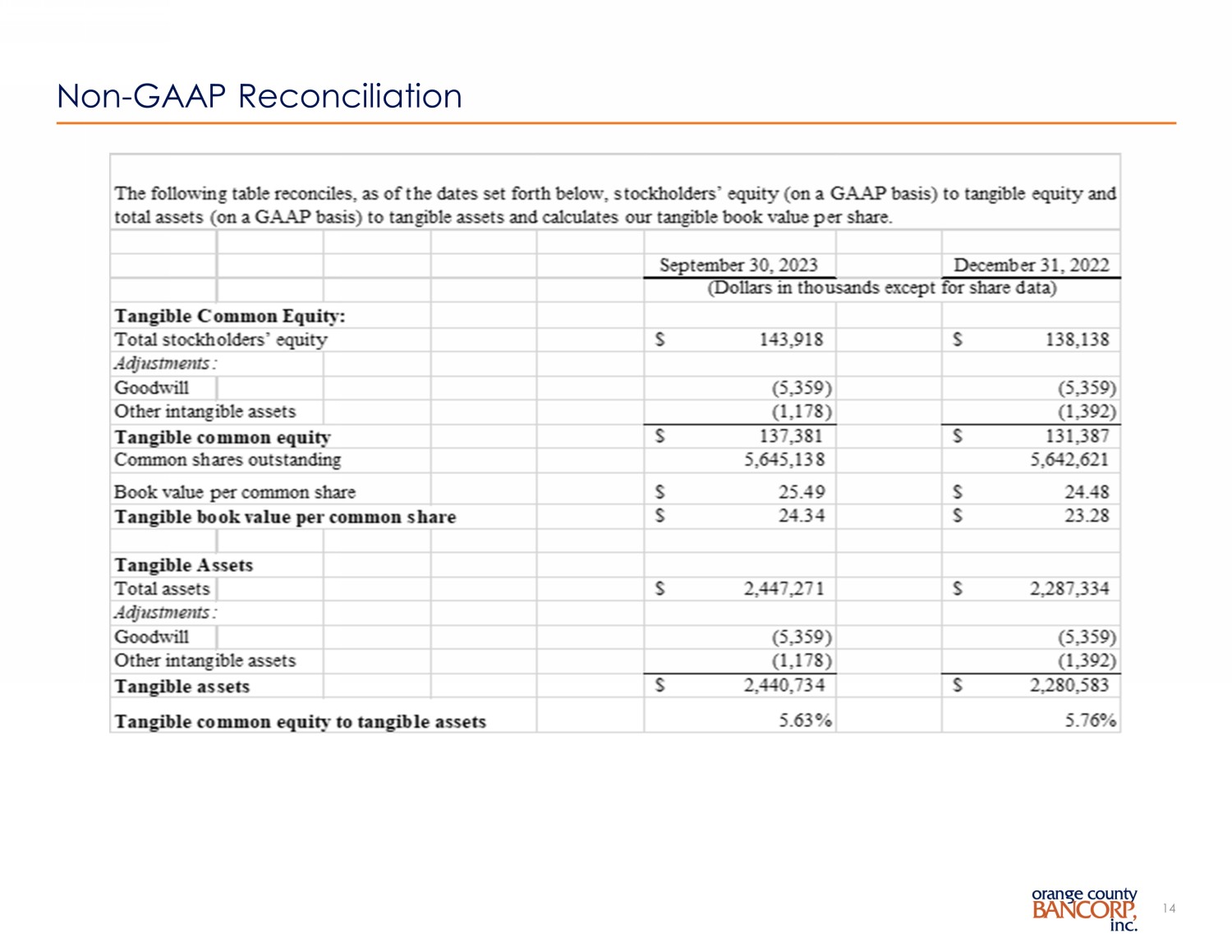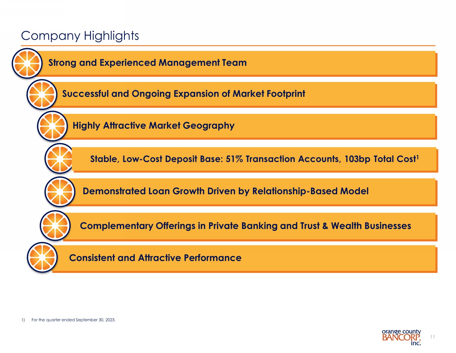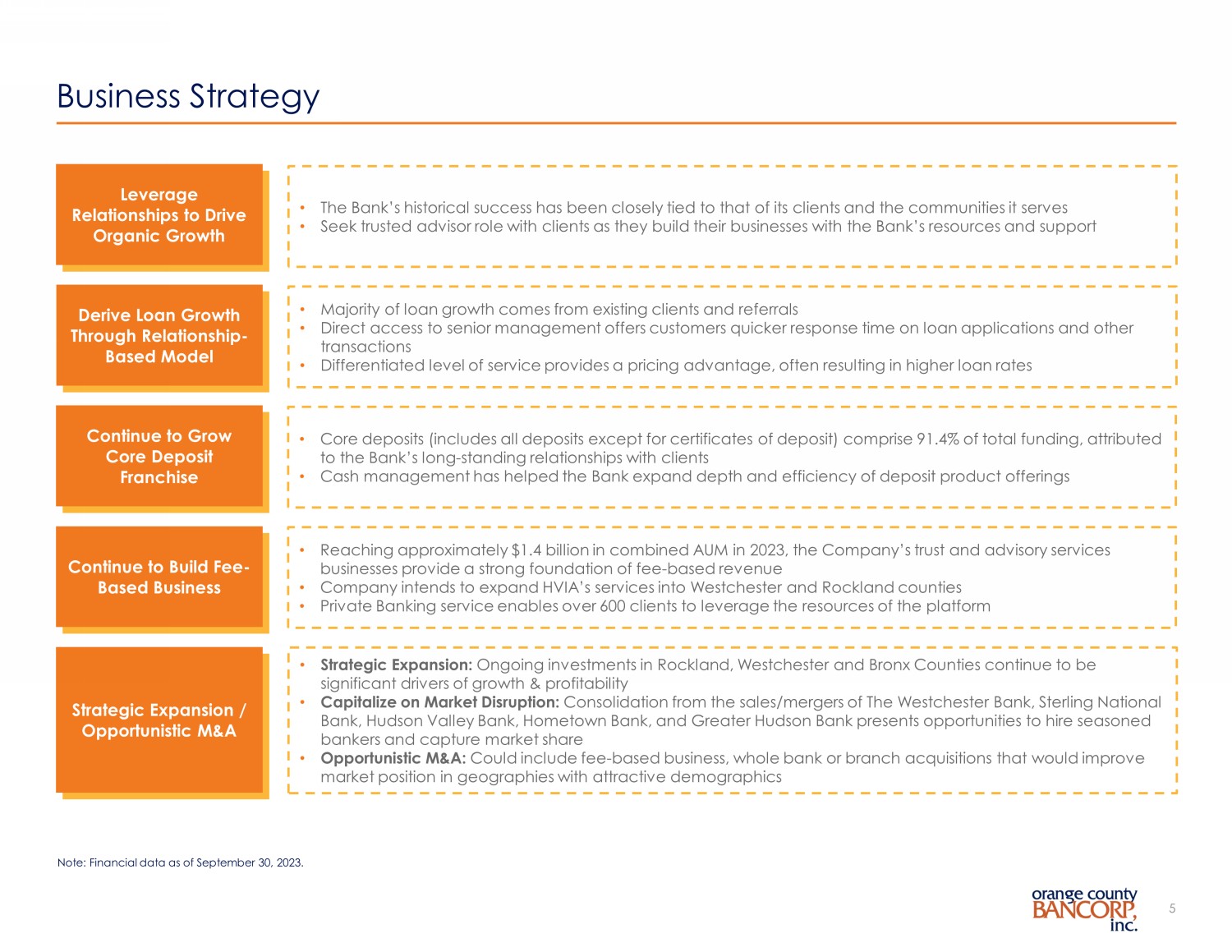 Structure & Scope Balanced, Client - Driven Business Model 4 Business Banking Private Banking Orange Wealth Management • 15 current branches, Yonkers location opening in 2024 • Focus on small to medium size businesses in the communities served • Seasoned lenders with significant regional and industry expertise • Comprehensive product offering • Full treasury management suite Key Metrics $1.7 billion loans $2.1 billion deposits • Launched in mid 2017 • Division of Orange Bank & Trust • Client - driven service linking our four primary product areas 1) Cash Management / Treasury 2) Loans (Commercial and/or Residential) 3) Trust, Estate and Custody Services 4) Investment Advisory Services (through HVIA) Over 600 Clients • Subsidiary of Orange County Bancorp, Inc. • Acquired in late 2012 from Sterling Bancorp • SEC registered Investment Advisor $1.4 billion AUM • Founding division of the Bank • Traditional trust & administration services to local clients • Niche focus on Special Needs Trust and Guardianship services Note: Key financials are as of September 30, 2023. Client - Driven Service Unifies Three Unique Product Areas