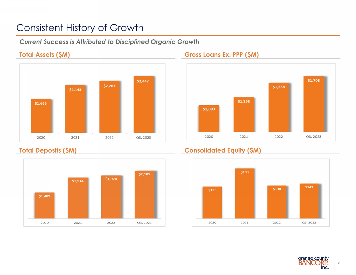 Business Strategy 5 Note: Financial data as of September 30, 2023. Leverage Relationships to Drive Organic Growth Derive Loan Growth Through Relationship - Based Model Continue to Grow Core Deposit Franchise Continue to Build Fee - Based Business Strategic Expansion / Opportunistic M&A • The Bank’s historical success has been closely tied to that of its clients and the communities it serves • Seek trusted advisor role with clients as they build their businesses with the Bank’s resources and support • Majority of loan growth comes from existing clients and referrals • Direct access to senior management offers customers quicker response time on loan applications and other transactions • Differentiated level of service provides a pricing advantage, often resulting in higher loan rates • Core deposits (includes all deposits except for certificates of deposit) comprise 91.4% of total funding, attributed to the Bank’s long - standing relationships with clients • Cash management has helped the Bank expand depth and efficiency of deposit product offerings • Strategic Expansion: Ongoing investments in Rockland, Westchester and Bronx Counties continue to be significant drivers of growth & profitability • Capitalize on Market Disruption: Consolidation from the sales/mergers of The Westchester Bank, Sterling National Bank, Hudson Valley Bank, Hometown Bank, and Greater Hudson Bank presents opportunities to hire seasoned bankers and capture market share • Opportunistic M&A: Could include fee - based business, whole bank or branch acquisitions that would improve market position in geographies with attractive demographics • Reaching approximately $1.4 billion in combined AUM in 2023, the Company’s trust and advisory services businesses provide a strong foundation of fee - based revenue • Company intends to expand HVIA’s services into Westchester and Rockland counties • Private Banking service enables over 600 clients to leverage the resources of the platform