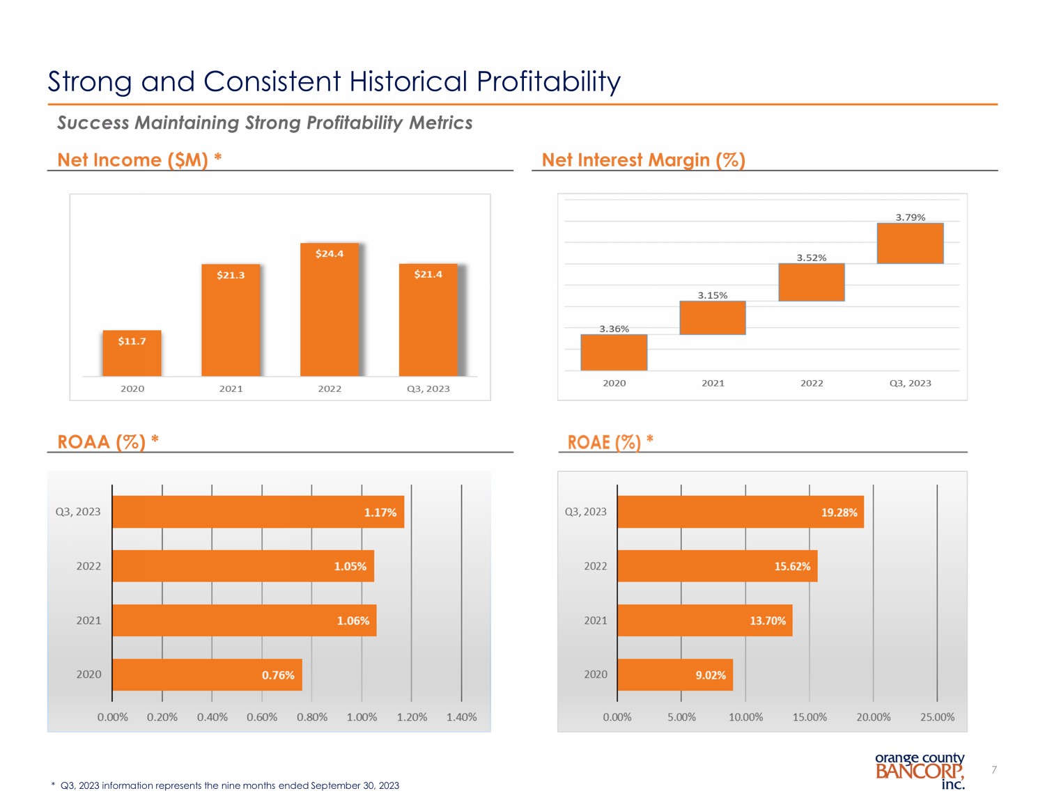 Consistent History of Growth 6 Current Success is Attributed to Disciplined Organic Growth Gross Loans Ex. PPP ($M) Total Assets ($M) Consolidated Equity ($M) Total Deposits ($M)