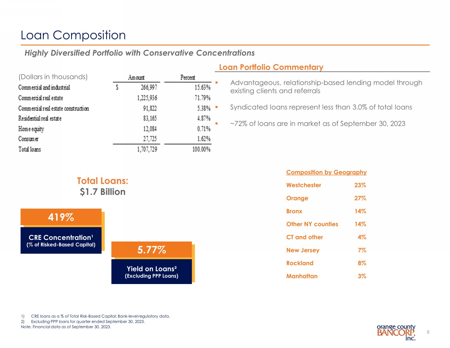 Strong and Consistent Historical Profitability 7 Net Interest Margin (%) Net Income ($M) * ROAA (%) * Success Maintaining Strong Profitability Metrics * Q3, 2023 information represents the nine months ended September 30, 2023