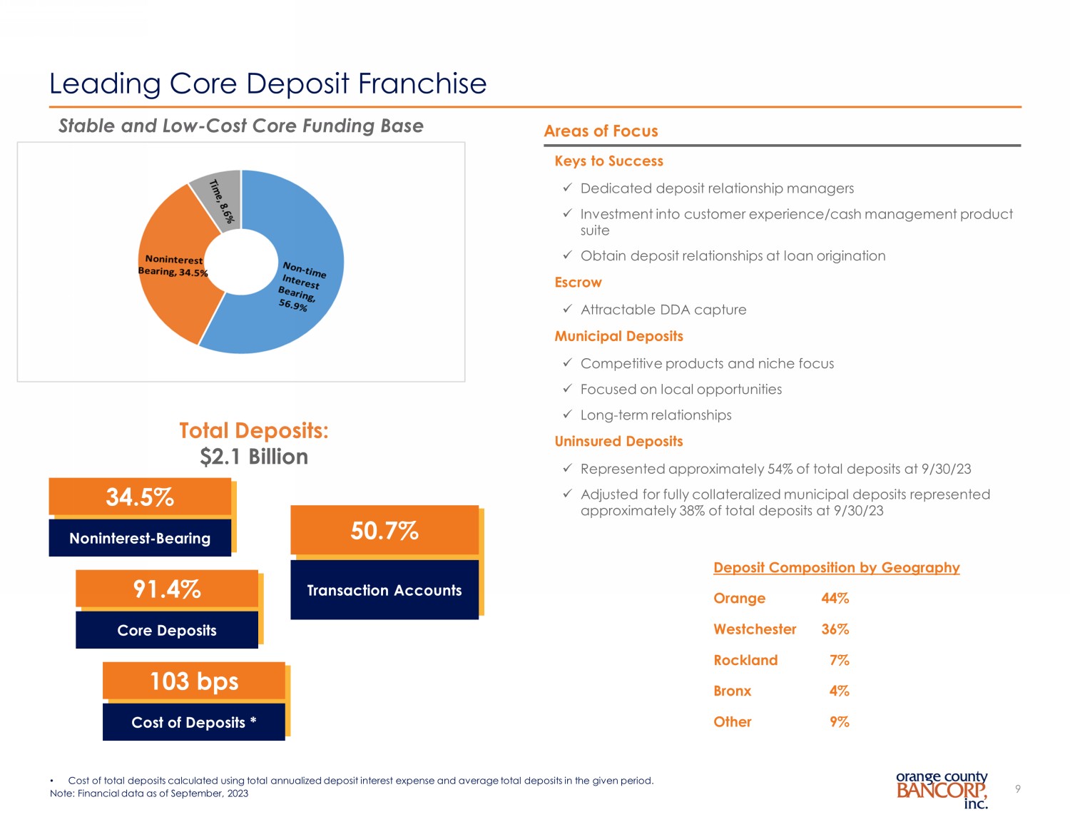 Loan Composition 8 1) CRE loans as a % of Total Risk - Based Capital; Bank - level regulatory data. 2) Excluding PPP loans for quarter ended September 30, 2023. Note: Financial data as of September 30, 2023. Total Loans: $1.7 Billion Highly Diversified Portfolio with Conservative Concentrations ▪ Advantageous, relationship - based lending model through existing clients and referrals ▪ Syndicated loans represent less than 3.0% of total loans ▪ ~72% of loans are in market as of September 30, 2023 Composition by Geography Westchester 23% Orange 27% Bronx 14% Other NY counties 14% CT and other 4% New Jersey 7% Rockland 8% Manhattan 3% 419% CRE Concentration¹ (% of Risked - Based Capital) 5.77% Yield on Loans² (Excluding PPP Loans) Loan Portfolio Commentary (Dollars in thousands)