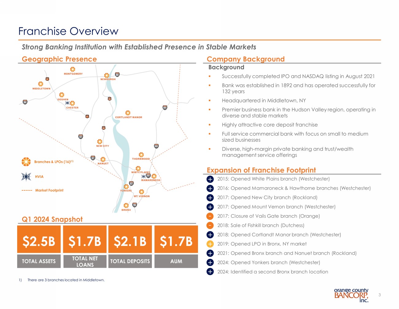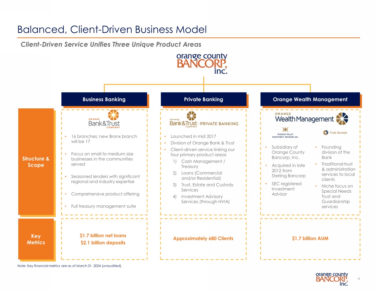 Franchise Overview 3 1) There are 3 branches located in Middletown. Background ▪ Successfully completed IPO and NASDAQ listing in August 2021 ▪ Bank was established in 1892 and has operated successfully for 132 years ▪ Headquartered in Middletown, NY ▪ Premier business bank in the Hudson Valley region, operating in diverse and stable markets ▪ Highly attractive core deposit franchise ▪ Full service commercial bank with focus on small to medium sized businesses ▪ Diverse, high - margin private banking and trust/wealth management service offerings Strong Banking Institution with Established Presence in Stable Markets Geographic Presence $2.5B TOTAL ASSETS $1.7B TOTAL NET LOANS $2.1B TOTAL DEPOSITS $1.7B AUM Company Background Q1 2024 Snapshot - + + + + + + + - 2015: Opened White Plains branch (Westchester) 2016: Opened Mamaroneck & Hawthorne branches (Westchester) 2017: Opened New City branch (Rockland) 2017: Opened Mount Vernon branch (Westchester) 2017: Closure of Vails Gate branch (Orange) 2018: Sale of Fishkill branch (Dutchess) 2018: Opened Cortlandt Manor branch (Westchester) 2019: Opened LPO in Bronx, NY market 2021: Opened Bronx branch and Nanuet branch (Rockland) 2024: Opened Yonkers branch (Westchester) 2024: Identified a second Bronx branch location Branches & LPOs (16) (1) Market Footprint Expansion of Franchise Footprint HVIA + +