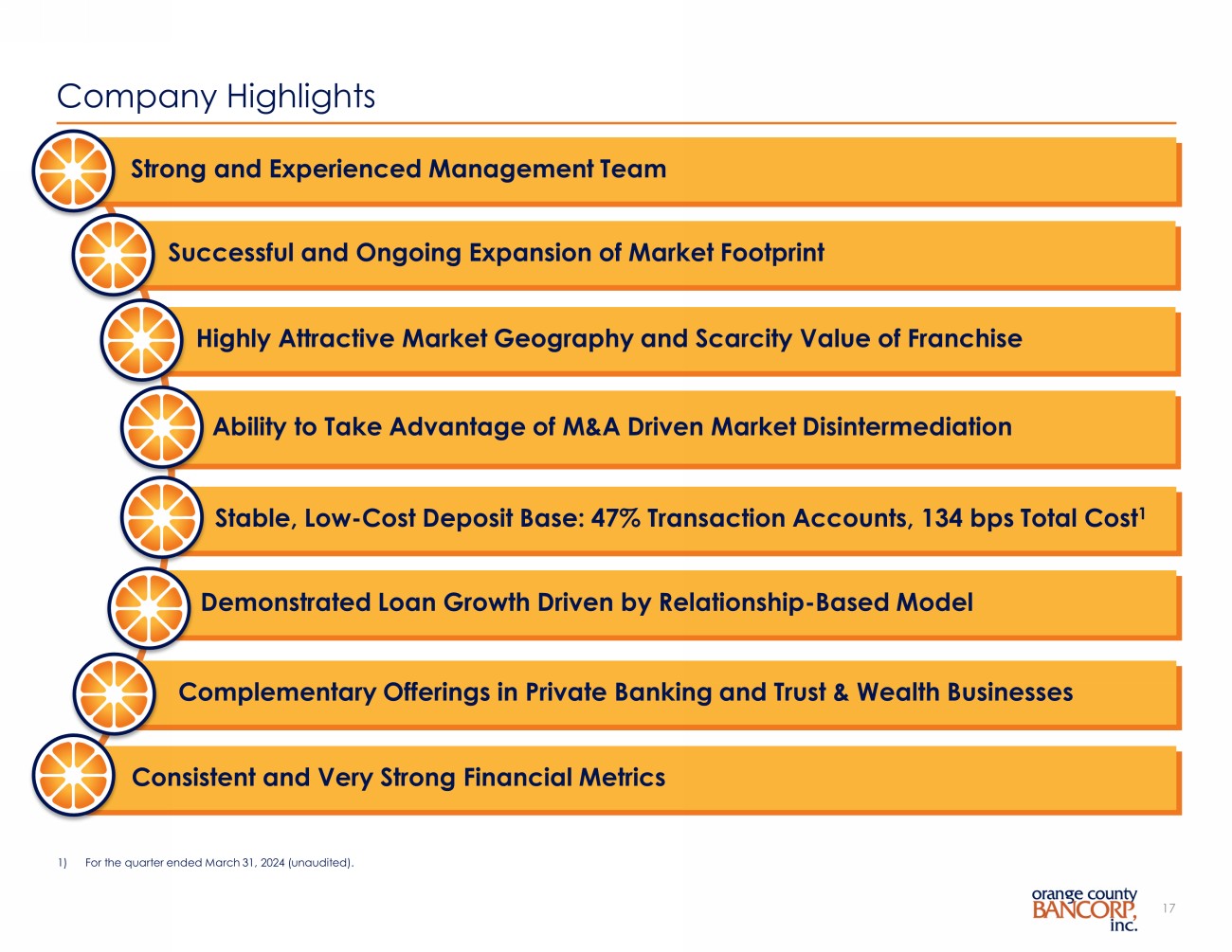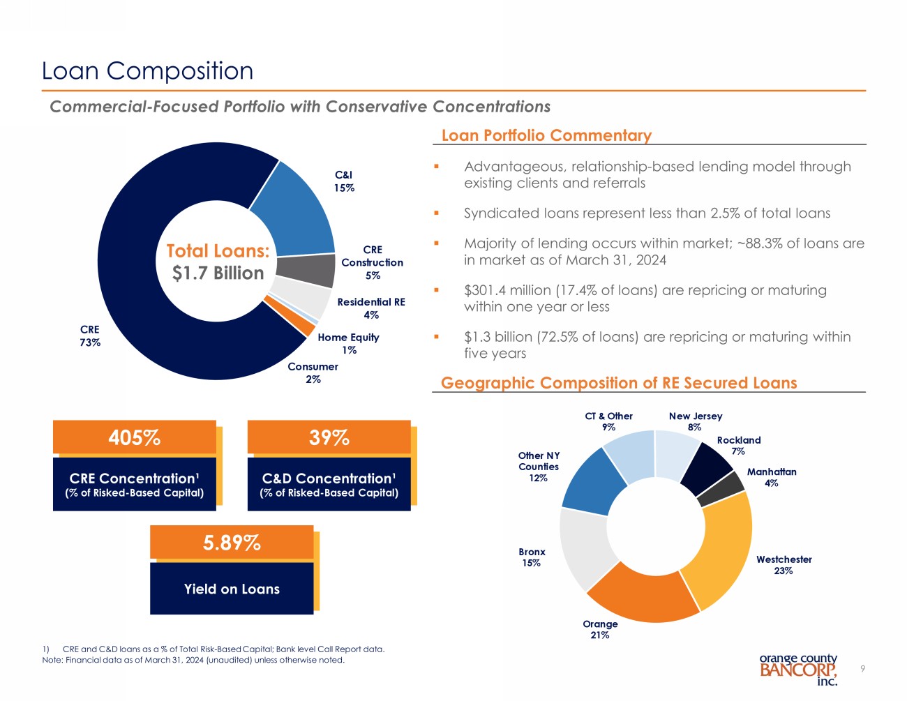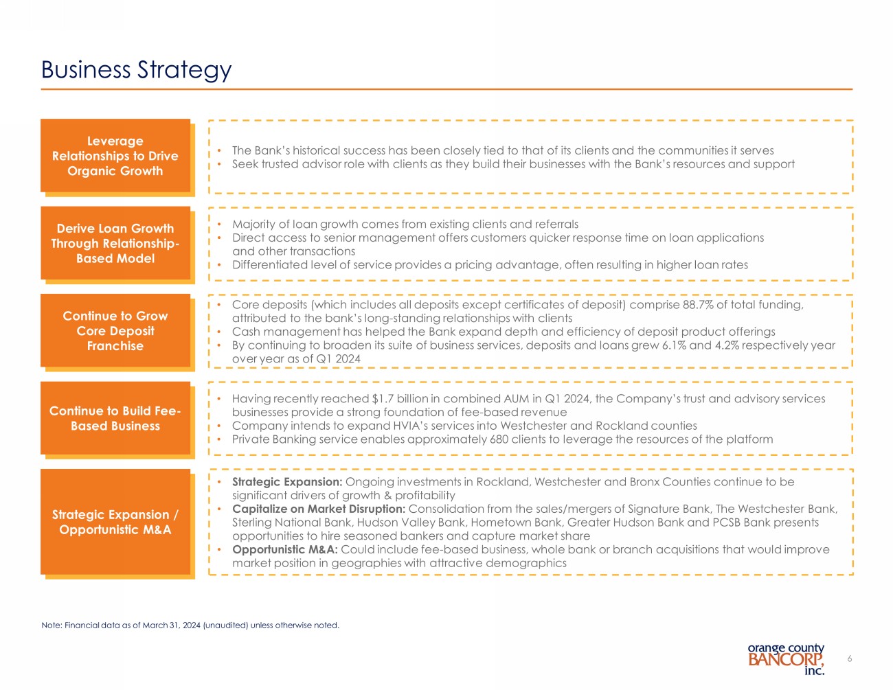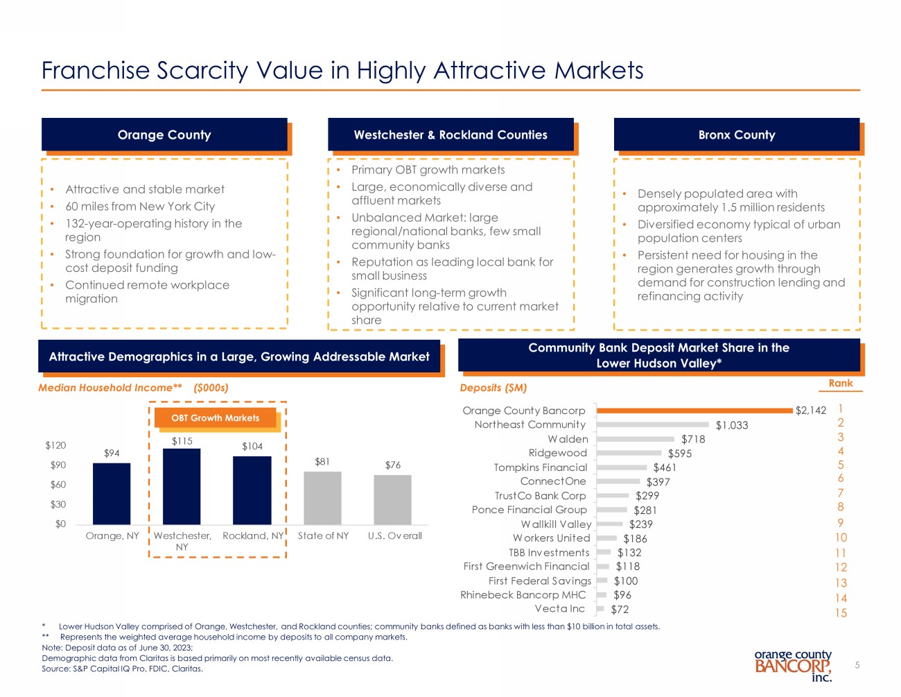 Structure & Scope Balanced, Client - Driven Business Model 4 Business Banking Private Banking Orange Wealth Management • 16 branches; new Bronx branch will be 17 • Focus on small to medium size businesses in the communities served • Seasoned lenders with significant regional and industry expertise • Comprehensive product offering • Full treasury management suite Key Metrics $1.7 billion net loans $2.1 billion deposits • Launched in mid 2017 • Division of Orange Bank & Trust • Client - driven service linking our four primary product areas 1) Cash Management / Treasury 2) Loans (Commercial and/or Residential) 3) Trust, Estate and Custody Services 4) Investment Advisory Services (through HVIA) Approximately 680 Clients • Subsidiary of Orange County Bancorp, Inc. • Acquired in late 2012 from Sterling Bancorp • SEC registered Investment Advisor $1.7 billion AUM • Founding division of the Bank • Traditional trust & administration services to local clients • Niche focus on Special Needs Trust and Guardianship services Note: Key financial metrics are as of March 31, 2024 (unaudited). Client - Driven Service Unifies Three Unique Product Areas
