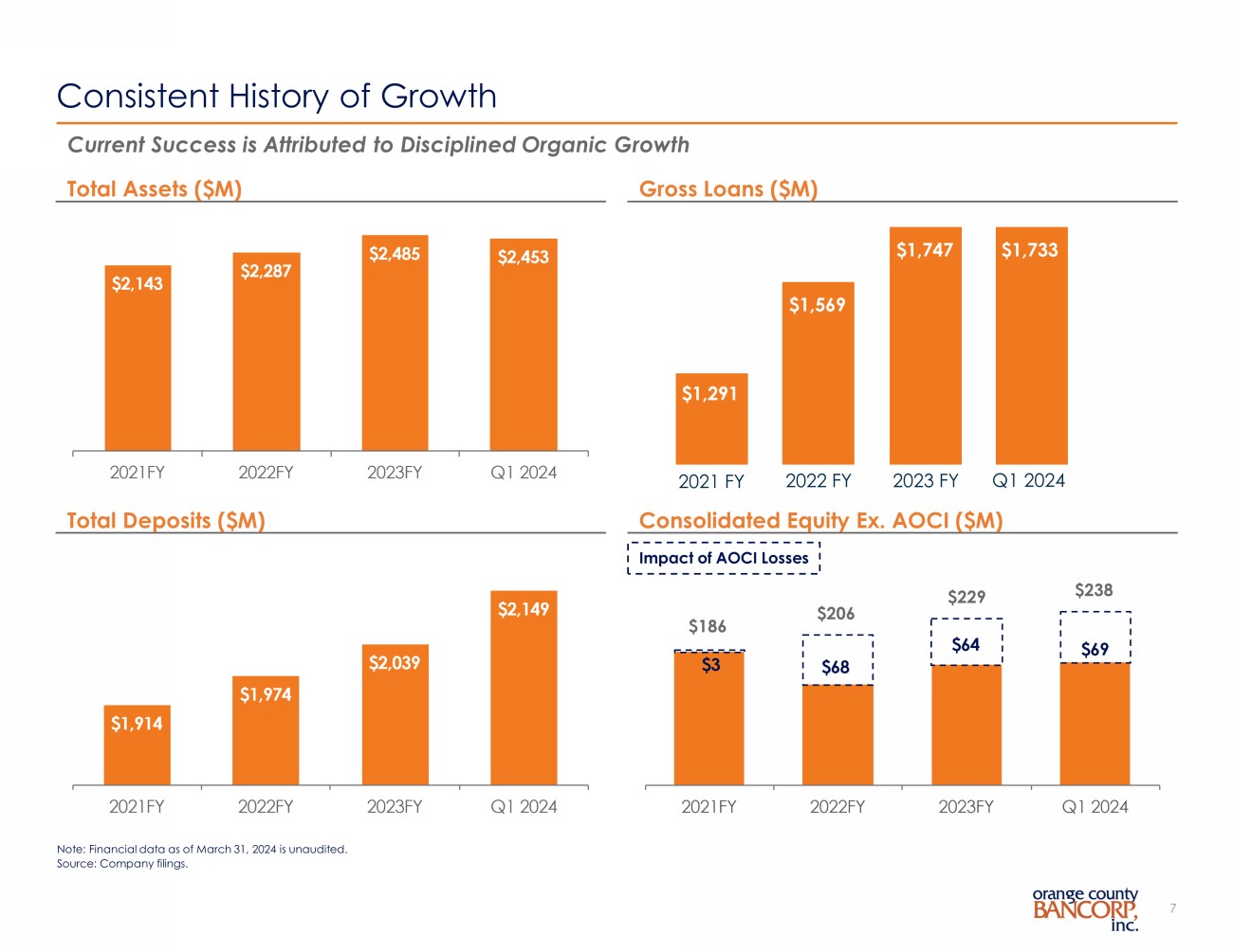 Business Strategy 6 Note: Financial data as of March 31, 2024 (unaudited) unless otherwise noted. Leverage Relationships to Drive Organic Growth Derive Loan Growth Through Relationship - Based Model Continue to Grow Core Deposit Franchise Continue to Build Fee - Based Business Strategic Expansion / Opportunistic M&A • The Bank’s historical success has been closely tied to that of its clients and the communities it serves • Seek trusted advisor role with clients as they build their businesses with the Bank’s resources and support • Majority of loan growth comes from existing clients and referrals • Direct access to senior management offers customers quicker response time on loan applications and other transactions • Differentiated level of service provides a pricing advantage, often resulting in higher loan rates • Core deposits (which includes all deposits except certificates of deposit) comprise 88.7% of total funding, attributed to the bank’s long - standing relationships with clients • Cash management has helped the Bank expand depth and efficiency of deposit product offerings • By continuing to broaden its suite of business services, deposits and loans grew 6.1% and 4.2% respectively year over year as of Q1 2024 • Strategic Expansion: Ongoing investments in Rockland, Westchester and Bronx Counties continue to be significant drivers of growth & profitability • Capitalize on Market Disruption: Consolidation from the sales/mergers of Signature Bank, The Westchester Bank, Sterling National Bank, Hudson Valley Bank, Hometown Bank, Greater Hudson Bank and PCSB Bank presents opportunities to hire seasoned bankers and capture market share • Opportunistic M&A: Could include fee - based business, whole bank or branch acquisitions that would improve market position in geographies with attractive demographics • Having recently reached $1.7 billion in combined AUM in Q1 2024, the Company’s trust and advisory services businesses provide a strong foundation of fee - based revenue • Company intends to expand HVIA’s services into Westchester and Rockland counties • Private Banking service enables approximately 680 clients to leverage the resources of the platform
