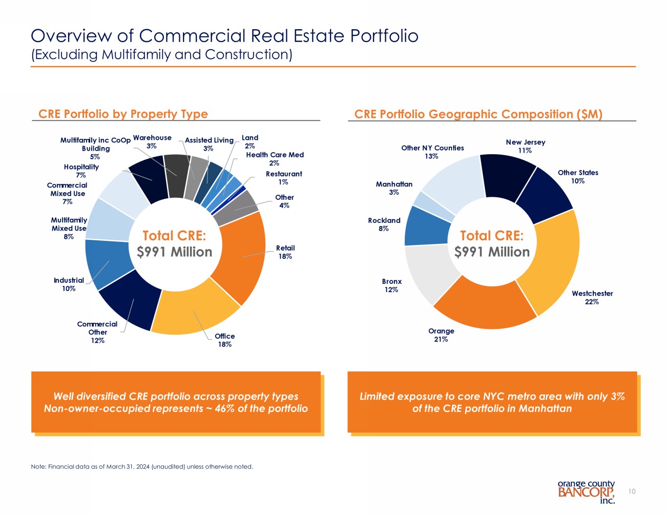 &5( & , &5( &RQVWUXFWLRQ 5HVLGHQWLDO 5( +RPH (TXLW\ &RQVXPHU Loan Composition 9 1) CRE and C&D loans as a % of Total Risk - Based Capital; Bank level Call Report data. Note: Financial data as of March 31, 2024 (unaudited) unless otherwise noted. Total Loans: $1.7 Billion Commercial - Focused Portfolio with Conservative Concentrations ▪ Advantageous, relationship - based lending model through existing clients and referrals ▪ Syndicated loans represent less than 2.5% of total loans ▪ Majority of lending occurs within market; ~88.3% of loans are in market as of March 31, 2024 ▪ $301.4 million (17.4% of loans) are repricing or maturing within one year or less ▪ $1.3 billion (72.5% of loans) are repricing or maturing within five years Geographic Composition of RE Secured Loans Loan Portfolio Commentary 5.89% Yield on Loans 405% CRE Concentration¹ (% of Risked - Based Capital) 39% C&D Concentration¹ (% of Risked - Based Capital) :HVWFKHVWHU 2UDQJH %URQ[ 2WKHU 1< &RXQWLHV &7 2WKHU 1HZ -HUVH\ 5RFNODQG 0DQKDWWDQ