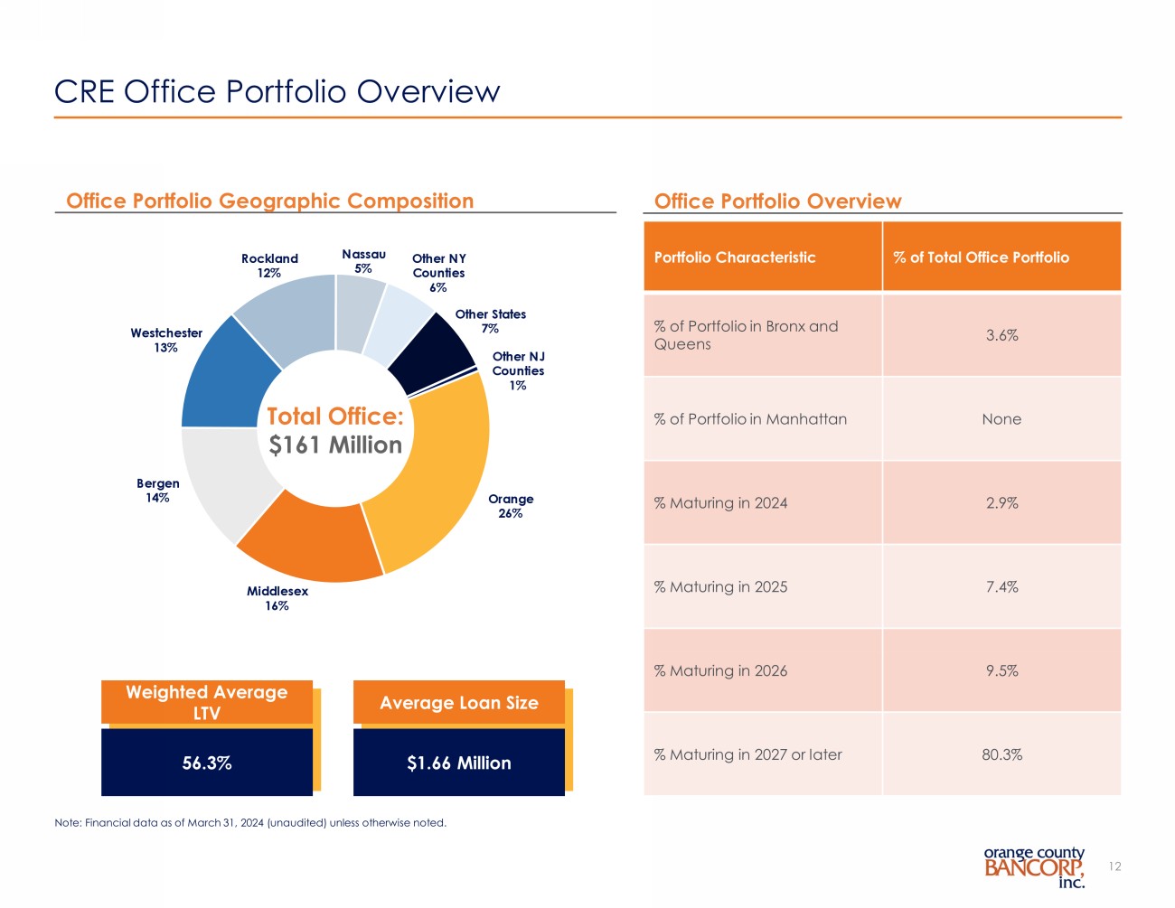Overview of Multifamily Portfolio 11 Note: Financial data as of March 31, 2024 (unaudited) unless otherwise noted. Multifamily Portfolio Detail Multifamily Portfolio Geographic Composition Weighted Average LTV 57.1% Average Loan Size $2.18 Million Portfolio Characteristic % of Total Multifamily Portfolio % of Portfolio Rent Stabilized 23.7% % of Portfolio Rent Controlled 3.1% % Maturing in 2024 0.6% % Maturing in 2025 6.6% % Maturing in 2026 7.5% % Maturing in 2027 or later 85.4% %URQ[ :HVWFKHVWHU 2UDQJH 0DQKDWWDQ 5RFNODQG 2WKHU 6WDWHV 2WKHU 1< &RXQWLHV 1HZ -HUVH\ Total Multi: $272 Million