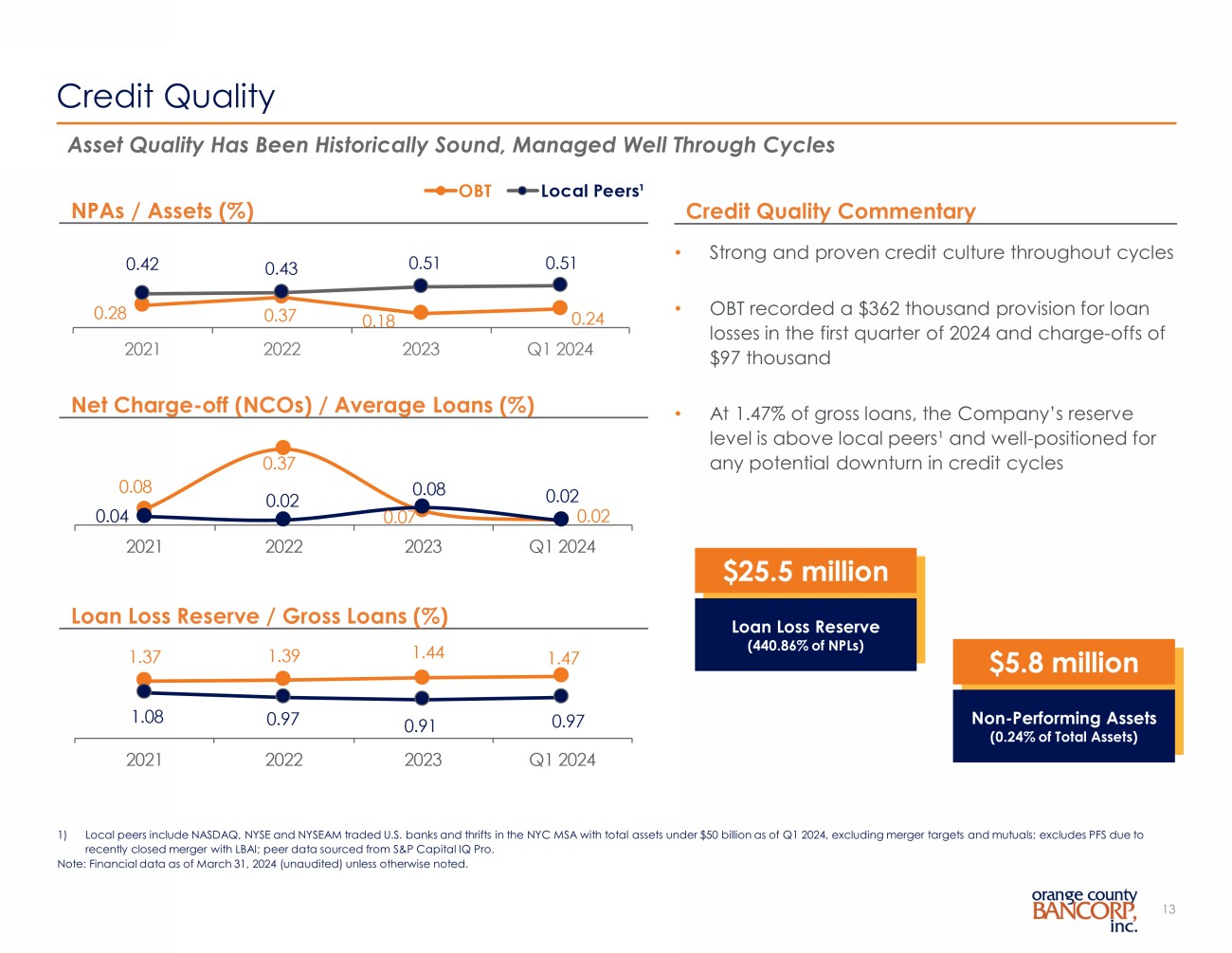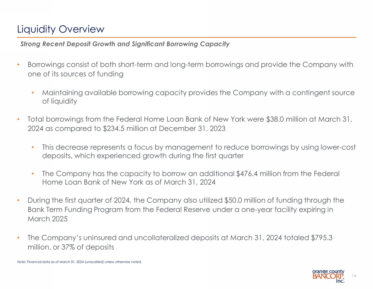 Credit Quality 13 1) Local peers include NASDAQ, NYSE and NYSEAM traded U.S. banks and thrifts in the NYC MSA with total assets under $50 billion as of Q1 2024, excluding merger targets and mutuals; excludes PFS due to recently closed merger with LBAI; peer data sourced from S&P Capital IQ Pro. Note: Financial data as of March 31, 2024 (unaudited) unless otherwise noted. Asset Quality Has B een Historically Sound, Managed Well Through Cycles • Strong and proven credit culture throughout cycles • OBT recorded a $362 thousand provision for loan losses in the first quarter of 2024 and charge - offs of $97 thousand • At 1.47% of gross loans, the Company’s reserve level is above local peers¹ and well - positioned for any potential downturn in credit cycles Credit Quality Commentary 4 4 NPAs / Assets (%) Net Charge - off (NCOs) / Average Loans (%) 4 Loan Loss Reserve / Gross Loans (%) 4 2%7 /RFDO 3HHUV ñ $5.8 million Non - Performing Assets (0.24% of Total Assets) $25.5 million Loan Loss Reserve (440.86% of NPLs)