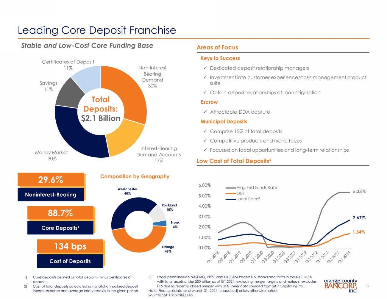 Liquidity Overview 14 Note: Financial data as of March 31, 2024 (unaudited) unless otherwise noted. Strong Recent Deposit Growth and Significant Borrowing Capacity • Borrowings consist of both short - term and long - term borrowings and provide the Company with one of its sources of funding • Maintaining available borrowing capacity provides the Company with a contingent source of liquidity • Total borrowings from the Federal Home Loan Bank of New York were $38.0 million at March 31, 2024 as compared to $234.5 million at December 31, 2023 • This decrease represents a focus by management to reduce borrowings by using lower - cost deposits, which experienced growth during the first quarter • The Company has the capacity to borrow an additional $476.4 million from the Federal Home Loan Bank of New York as of March 31, 2024 • During the first quarter of 2024, the Company also utilized $50.0 million of funding through the Bank Term Funding Program from the Federal Reserve under a one - year facility expiring in March 2025 • The Company’s uninsured and uncollateralized deposits at March 31, 2024 totaled $795.3 million, or 37% of deposits