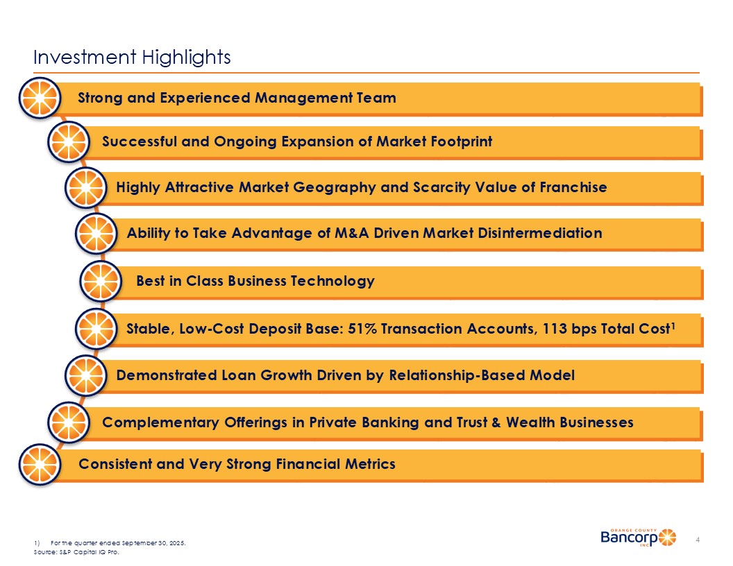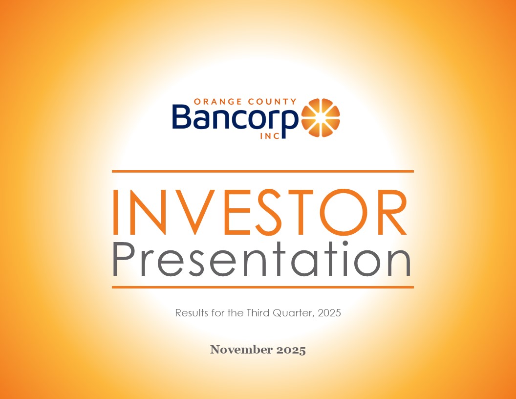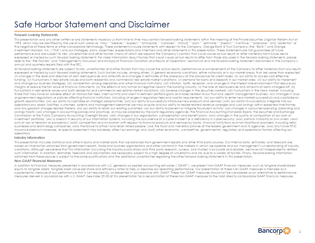 Safe Harbor Statement and Disclaimer Forward - Looking Statements This presentation and any other written or oral statements made by us from time to time may contain forward - looking statements w ithin the meaning of the Private Securities Litigation Reform Act of 1995, which may be identified by the use of such words as “may,” “believe,” “expect,” “anticipate,” “consider,” “should,” “pl an, ” “estimate,” “predict,” “continue,” “probable,” and “potential” or the negative of these terms or other comparable terminology. These statements include statements with respect to the Company, Or ange Bank & Trust Company (the “Bank”) and Orange Investment Advisors, Inc. (“OIA”) and our strategies, plans, objectives, expectations and intentions and other statements in thi s presentation. These statements are not guarantees of future performance and are subject to risks, uncertainties and other factors (many of which are beyond the Company’s control) that c oul d cause actual results to differ materially from future results expressed or implied by such forward - looking statements. For more information about factors that could cause actual results to d iffer from those discussed in the forward - looking statements, please refer to the “Risk Factors” and “Management's Discussion and Analysis of Financial Condition and Results of Operations” secti ons of and the forward - looking statement disclaimers in the Company’s annual and quarterly reports filed with the SEC. All forward - looking statements are subject to risks, uncertainties and other factors that may cause the actual results, performa nce or achievements of the Company to differ materially from any results expressed or implied by such forward - looking statements. Such factors include, among others: (i) general economic conditions, ei ther nationally or in our market areas, that are worse than expected; (ii) changes in the level and direction of loan delinquencies and write - offs and changes in estimates of the adequacy of the all owance for credit losses; (iii) our ability to access cost - effective funding; (iv) fluctuations in real estate values and both residential and commercial real estate market conditions; (v) deman d f or loans and deposits in our market area; (vi) our ability to implement and change our business strategies; (vii) competition among depository and other financial institutions; (viii) inflation, ta rif fs, recession, and changes in the interest rate environment that reduce our margins or reduce the fair value of financial instruments; (ix) the effects of any turmoil or negative news in the banking in dus try; (x) the rate of delinquencies and amounts of loans charged - off; (xi) fluctuations in real estate values and both residential and commercial real estate market conditions; (xii) adverse changes i n t he securities markets; (xiii) fluctuations in the stock market, including those that may have an adverse effect on transaction fees, client activity and client investment portfolio gains and losses r ela ted to our trust and wealth management business; (xiv) changes in laws or government regulations or policies affecting financial institutions, including changes in regulatory fees and capital requ ire ments; (xv) our ability to enter new markets successfully and capitalize on growth opportunities; (xvi) our ability to capitalize on strategic opportunities; (xvii) our ability to successfully introduc e n ew products and services; (xviii) our ability to successfully integrate into our operations any assets, liabilities, customers, systems and management personnel we may acquire and our ability to realize rel ate d revenue synergies and cost savings within expected time frames, and any goodwill charges related thereto; (xix) our ability to retain our existing customers; (xx) our ability to prevent or mit igate fraudulent activity; (xxi) changes in consumer spending, borrowing and savings habits; (xxii) changes in accounting policies and practices, as may be adopted by the bank regulatory agencies, the F ina ncial Accounting Standards Board, the Securities and Exchange Commission or the Public Company Accounting Oversight Board; (xxiii) changes in our organization, compensation and benefit pl ans ; (xxiv) changes in the quality or composition of our loan or investment portfolios; (xxv) a breach in security of our information systems, including the occurrence of a cyber incident or a deficiency in cyber security; (xxvi) political instability or civil unrest; (xxvii) acts of war or terrorism or pandemics; (xxviii) competition and innovation with respect to financial products and services by ba nks, financial institutions and non - traditional providers, including retail businesses and technology companies; (xxix) the failure to attract and retain skilled people; (xxx) the fiscal and monetary p oli cies of the federal government and its agencies; (xxxi) any future FDIC insurance premium increases, or special assessment may adversely affect our earnings; and (xxxii) other economic, competitive , g overnmental, regulatory and operational factors affecting our operations. Industry Information This presentation includes statistical and other industry and market data that we obtained from government reports and other thi rd - party sources. Our internal data, estimates, and forecasts are based on information obtained from government reports, trade and business organizations and other contacts in the markets in whi ch we operate and our management’s understanding of industry conditions. Although we believe that this information (including the industry publications and third party research, surveys, an d studies) is accurate and reliable, we have not independently verified such information. In addition, estimates, forecasts and assumptions are necessarily subject to a high degree of uncertainty a nd risk due to a variety of factors. Finally, forward - looking 