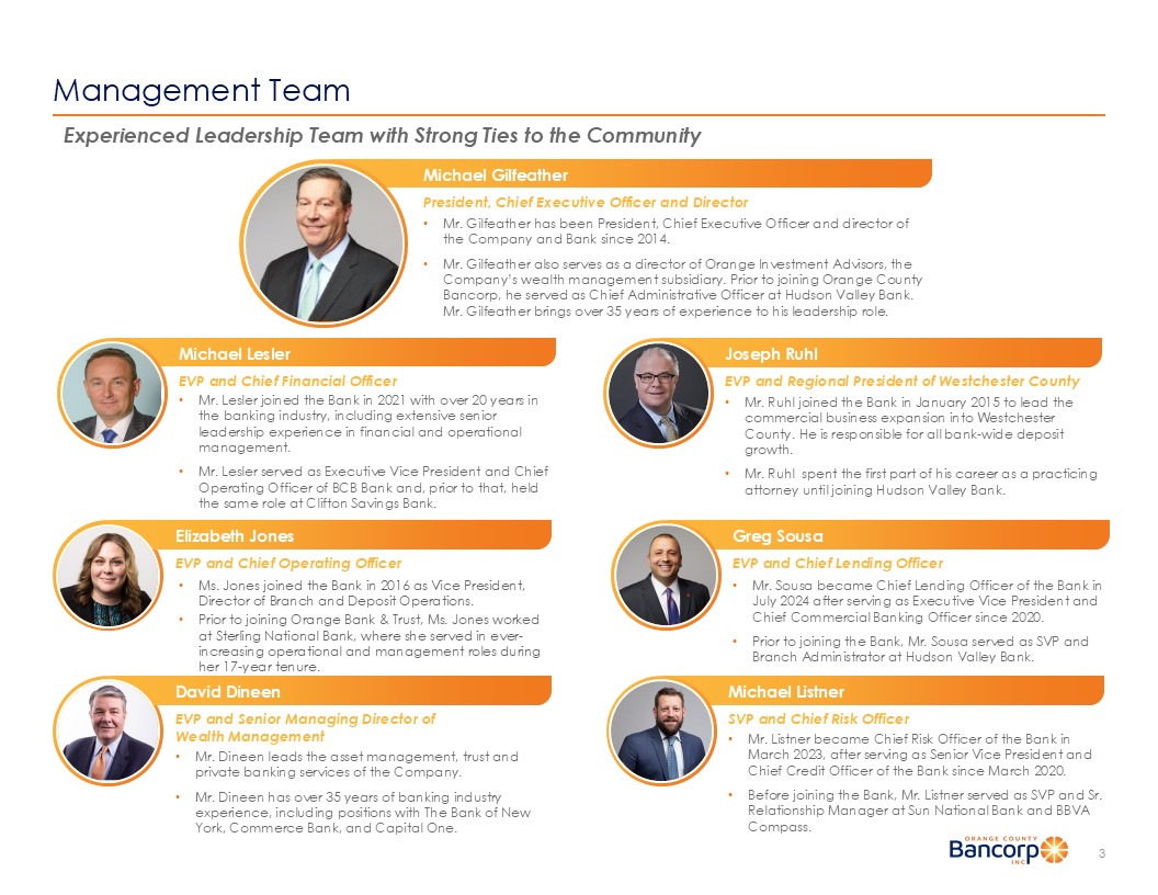 • Mr. Sousa became Chief Lending Officer of the Bank in July 2024 after serving as Executive Vice President and Chief Commercial Banking Officer since 2020. • Prior to joining the Bank, Mr. Sousa served as SVP and Branch Administrator at Hudson Valley Bank. Greg Sousa EVP and Chief Lending Officer Management Team 3 Experienced Leadership Team with Strong Ties to the Community • Mr. Gilfeather has been President, Chief Executive Officer and director of the Company and Bank since 2014. • Mr. Gilfeather also serves as a director of Orange Investment Advisors, the Company’s wealth management subsidiary. Prior to joining Orange County Bancorp, he served as Chief Administrative Officer at Hudson Valley Bank. Mr. Gilfeather brings over 35 years of experience to his leadership role. President, Chief Executive Officer and Director Michael Gilfeather • Mr. Listner became Chief Risk Officer of the Bank in March 2023, after serving as Senior Vice President and Chief Credit Officer of the Bank since March 2020. • Before joining the Bank, Mr. Listner served as SVP and Sr. Relationship Manager at Sun National Bank and BBVA Compass. Michael Listner SVP and Chief Risk Officer • Mr. Lesler joined the Bank in 2021 with over 20 years in the banking industry, including extensive senior leadership experience in financial and operational management. • Mr. Lesler served as Executive Vice President and Chief Operating Officer of BCB Bank and, prior to that, held the same role at Clifton Savings Bank. Michael Lesler E VP and Chief Financial Officer • Mr. Ruhl joined the Bank in January 2015 to lead the commercial business expansion into Westchester County. He is responsible for all bank - wide deposit growth. • Mr. Ruhl spent the first part of his career as a practicing attorney until joining Hudson Valley Bank. Joseph Ruhl EVP and Regional President of Westchester County • Mr. Dineen leads the asset management, trust and private banking services of the Company. • Mr. Dineen has over 35 years of banking industry experience, including positions with The Bank of New York, Commerce Bank, and Capital One. David Dineen EVP and Senior Managing Director of Wealth Management • Ms. Jones joined the Bank in 2016 as Vice President, Director of Branch and Deposit Operations. • Prior to joining Orange Bank & Trust, Ms. Jones worked at Sterling National Bank, where she served in ever - increasing operational and management roles during her 17 - year tenure. Elizabeth Jones EVP and Chief Operating Officer