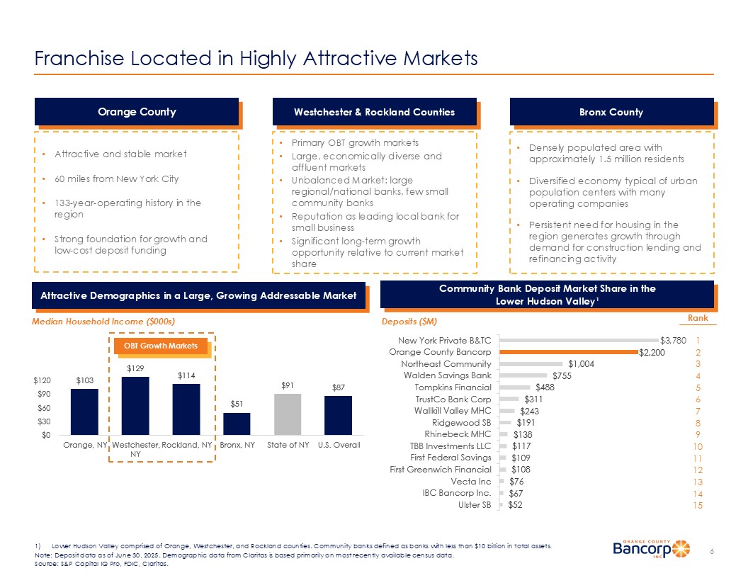 Franchise Overview 5 1) There are 2 branches located in Middletown and 2 branches located in the Bronx. Source: S&P Capital IQ Pro. Background ▪ Successfully completed IPO and NASDAQ listing in August 2021 ▪ Bank was established in 1892 and has operated successfully for over 133 years ▪ Headquartered in Middletown, NY ▪ Operates through 17 branches and loan production offices ▪ Premier business bank in the Hudson Valley region, operating in diverse and stable markets ▪ Highly attractive core deposit franchise ▪ Full service commercial bank with focus on small to medium sized businesses ▪ Diverse, high - margin private banking and trust/wealth management service offerings Strong Banking Institution with Established Presence in Stable Markets Geographic Presence $1.9B TOTAL NET LOANS Company Background 3Q 2025 Snapshot - + + + + + + + - - 2015: Opened White Plains branch (Westchester) 2016: Opened Mamaroneck & Hawthorne branches (Westchester) 2017: Opened New City branch (Rockland) 2017: Opened Mount Vernon branch (Westchester) 2017: Closure of Vails Gate branch (Orange) 2018: Sale of Fishkill branch (Dutchess) 2018: Opened Cortlandt Manor branch (Westchester) 2019: Opened LPO in Bronx, NY market 2021: Opened Bronx branch and Nanuet branch (Rockland) 2024: Opened Yonkers branch (Westchester) 2025: Closure of one Middletown branch (Orange) 2025: Opened second Bronx branch Branches & LPOs (17) (1) Market Footprint Expansion of Franchise Footprint OIA + $2.3B TOTAL DEPOSITS $2.6B TOTAL ASSETS $1.9B AUM +