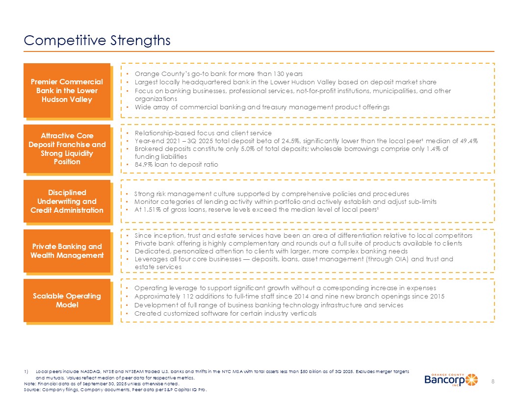 Structure & Scope Balanced, Client - Driven Business Model 7 Business Banking Orange Wealth Management • 17 branches and LPOs • Focus on small to medium size businesses, professionals, and non - profit entities in the communities served • Seasoned lenders with significant regional and industry expertise • Comprehensive product offering • Full treasury management suite Key Metrics $1.9 billion net loans $2.3 billion deposits • Launched in mid 2017 • Division of Orange Bank & Trust • Client - driven service linking our four primary product areas 1) Deposits with Cash Management / Treasury Services 2) Investment Advisory Services (through OIA) 3) Trust, Estate and Custody Services 4) Loans (Commercial and/or Residential) Approximately 700 Clients • Subsidiary of Orange County Bancorp, Inc. • Acquired in late 2012 from Sterling Bancorp • SEC registered Investment Advisor $1.9 billion AUM • Founding division of the Bank • Traditional trust & administration services to local clients • Niche focus on Special Needs Trust and Guardianship services Note: Key metrics as of September 30, 2025. Source: Company documents. Client - Driven Service Unifies Three Unique Product Areas Private Banking