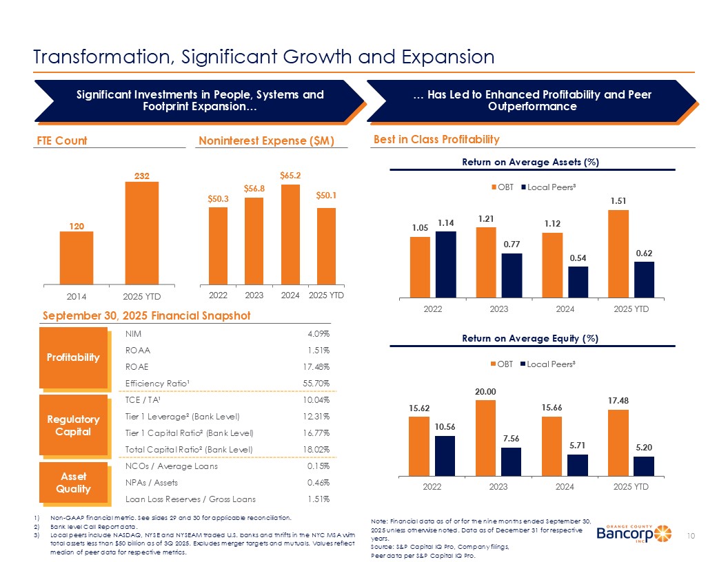 Business Strategy 9 Note: Financial data as of September 30, 2025 unless otherwise noted. Course: Company filings, S&P Capital IQ Pro. Leverage Relationships to Drive Organic Growth Derive Loan Growth Through Relationship - Based Model Continue to Grow Core Deposit Franchise Continue to Build Fee - Based Business Strategic Expansion / Opportunistic M&A • Seek trusted advisor role with clients as they build their businesses with the Bank’s resources and support • The Bank’s historical success has been closely tied to that of its clients and the communities it serves • Majority of loan growth comes from existing clients and referrals • Direct access to senior management offers customers quicker response time on loan applications and other transactions • Differentiated level of service provides a pricing advantage, often resulting in higher loan rates • Core deposits (which includes all deposits except certificates of deposit) comprise 95.0% of total funding, attributed to the Bank’s long - standing relationships with clients • Cash management has helped the Bank expand depth and efficiency of deposit product offerings • By continuing to broaden its suite of business services, deposits and loans grew 6.5% and 7.8% year over year as of 3Q 2025, respectively • Strategic Expansion: Ongoing investments in Rockland, Westchester and Bronx Counties continue to be significant drivers of growth & profitability • Capitalize on Market Disruption: Consolidation from the sales/mergers of Signature Bank, The Westchester Bank, Sterling National Bank, Hudson Valley Bank, Hometown Bank, Greater Hudson Bank, Catskill Hudson Bank and PCSB Bank presents opportunities to hire seasoned bankers and capture market share • Opportunistic M&A: Could include fee - based business, whole bank or branch acquisitions that would improve market position in geographies with attractive demographics • Having recently reached $1.9 billion in combined AUM in 3Q 2025, the Company’s trust and advisory services businesses provide a strong foundation of fee - based revenue • Company intends to further expand OIA’s services into Westchester and Rockland counties • Private Banking service enables approximately 700 clients to leverage the resources of the platform
