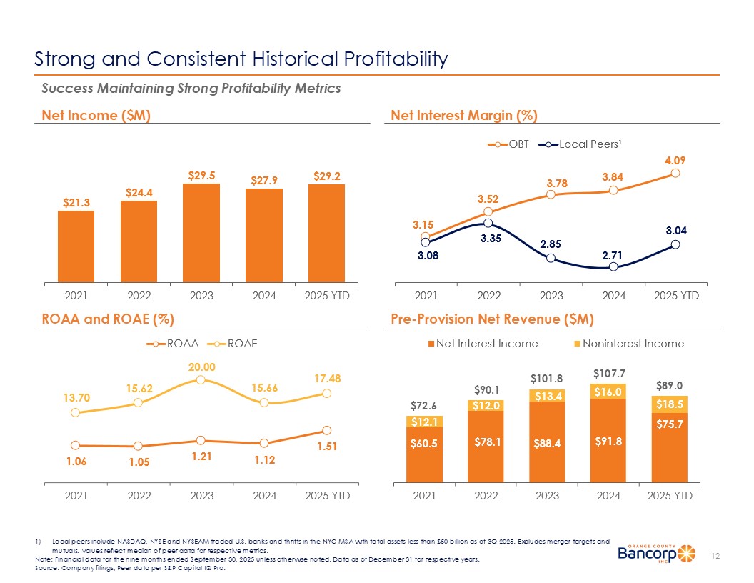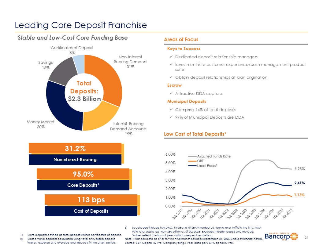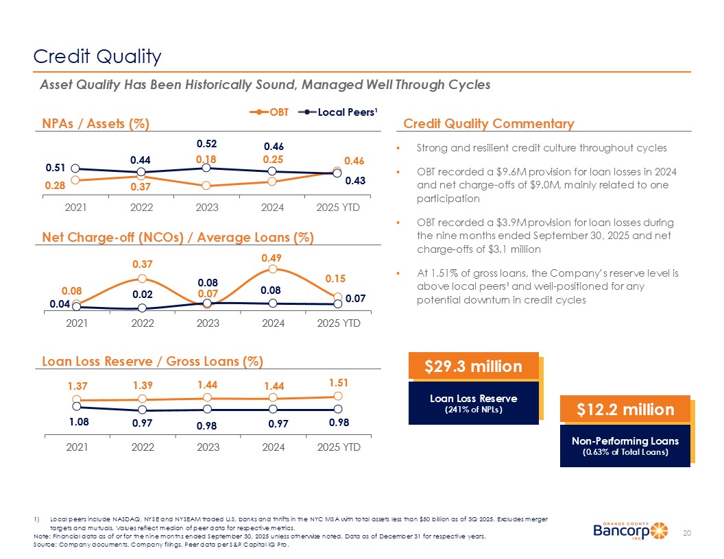 Credit Quality 20 1) Local peers include NASDAQ, NYSE and NYSEAM traded U.S. banks and thrifts in the NYC MSA with total assets less than $50 bill ion as of 3Q 2025. Excludes merger targets and mutuals. Values reflect median of peer data for respective metrics. Note: Financial data as of or for the nine months ended September 30, 2025 unless otherwise noted. Data as of December 31 for re spective years. Source: Company documents, Company filings, Peer data per S&P Capital IQ Pro. Asset Quality Has Been Historically Sound, Managed Well Through Cycles • Strong and resilient credit culture throughout cycles • OBT recorded a $ 9.6 M provision for loan losses in 2024 and net charge - offs of $ 9.0M, mainly related to one participation • OBT recorded a $3.9M provision for loan losses during the nine months ended September 30, 2025 and net charge - offs of $3.1 million • At 1.51% of gross loans, the Company’s reserve level is above local peers¹ and well - positioned for any potential downturn in credit cycles Credit Quality Commentary <7' <7' NPAs / Assets (%) Net Charge - off (NCOs) / Average Loans (%) <7' Loan Loss Reserve / Gross Loans (%) 4 2%7 /RFDO3HHUV ñ $12.2 million Non - Performing Loans (0.63% of Total Loans) $29.3 million Loan Loss Reserve (241% of NPLs)