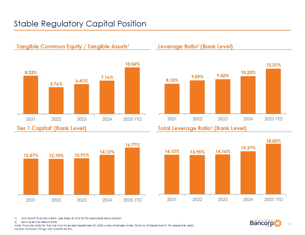 <7' <7' 2%7 /RFDO3HHUV ñ Strong and Consistent Historical Profitability 12 Net Interest Margin (%) Net Income ($M) Pre - Provision Net Revenue ($M) ROAA and ROAE (%) Success Maintaining Strong Profitabilit y Metrics 1) Local peers include NASDAQ, NYSE and NYSEAM traded U.S. banks and thrifts in the NYC MSA with total assets less than $50 bill ion as of 3Q 2025. Excludes merger targets and mutuals. Values reflect median of peer data for respective metrics. Note: Financial data for the nine months ended September 30, 2025 unless otherwise noted. Data as of December 31 for respecti ve years. Source: Company filings, Peer data per S&P Capital IQ Pro. <7' 52$$ 52$( <7' 1HW,QWHUHVW,QFRPH 1RQLQWHUHVW,QFRPH $72 .6 $9 0.1 $ 101.8 $107.7 $89.0