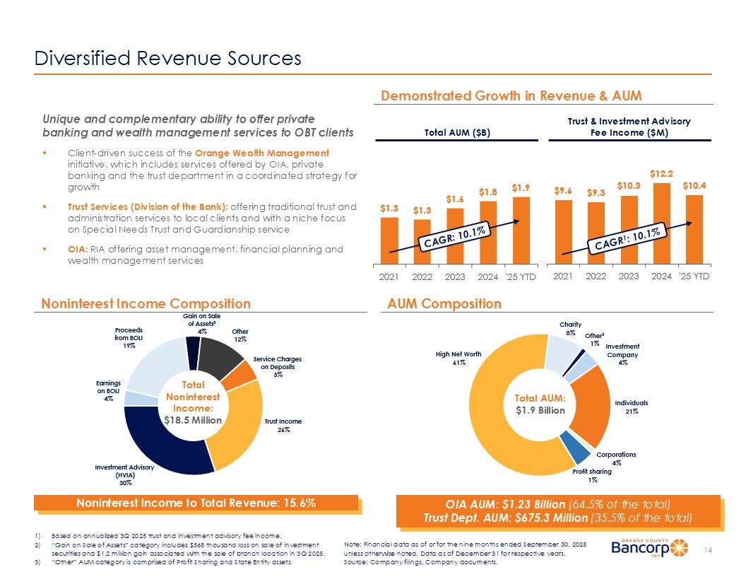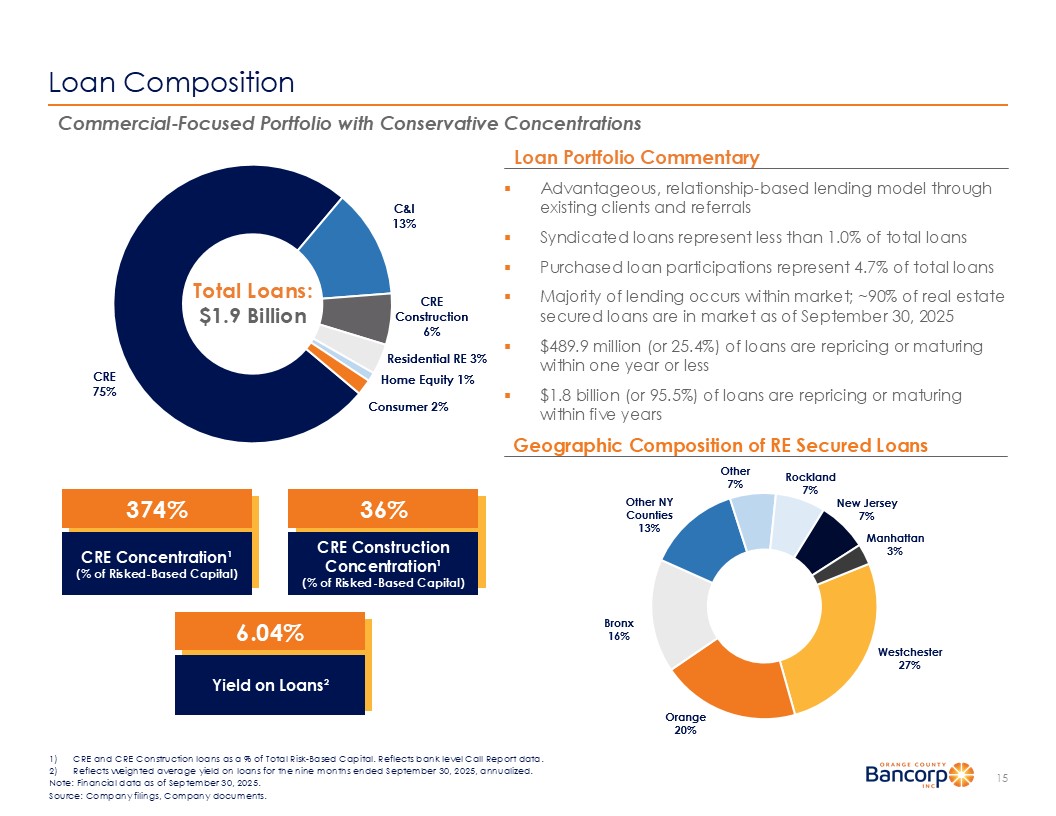 <7' <7' 6HUYLFH&KDUJHV RQ'HSRVLWV 7UXVW,QFRPH ,QYHVWPHQW$GYLVRU\ +9,$ (DUQLQJV RQ%2/, 3URFHHGV IURP%2/, *DLQRQ6DOH RI$VVHWV ò 2WKHU ,QYHVWPHQW &RPSDQ\ ,QGLYLGXDOV 3URILWVKDULQJ &RUSRUDWLRQV +LJK1HW:RUWK &KDULW\ 2WKHU ó Diversified Revenue Sources 1) Based on annualized 3Q 2025 trust and investment advisory fee income. 2) “Gain on Sale of Assets” category includes $568 thousand loss on sale of investment securities and $1.2 million gain associated with the sale of branch location in 3Q 2025. 3) “Other” AUM category is comprised of Profit Sharing and State Entity assets Noninterest Income Composition Total AUM: $1.9 Billion AUM Composition Unique and complementary ability to offer private banking and wealth management services to OBT clients ▪ Client - driven success of the Orange Wealth Management initiative, which includes services offered by OIA, private banking and the trust department in a coordinated strategy for growth ▪ Trust Services (Division of the Bank): offering traditional trust and administration services to local clients and with a niche focus on Special Needs Trust and Guardianship service ▪ OIA: RIA offering asset management, financial planning and wealth management services Demonstrated Growth in Revenue & AUM Noninterest Income to Total Revenue: 15.6% OIA AUM: $1.23 Billion (64.5% of the total) Trust Dept. AUM: $675.3 Million (35.5% of the total) Total AUM ($B) 14 Total Noninterest Income : $18.5 Million Trust & Investment Advisory Fee Income ($M) Note: Financial data as of or for the nine months ended September 30, 2025 unless otherwise noted. Data as of December 31 for respective years. Source: Company filings, Company documents.