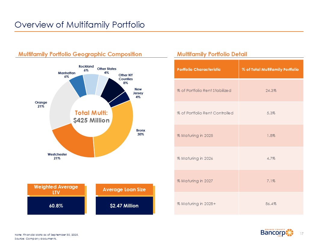 0XOWLIDPLO\ 2WKHU 122 5HWDLO 2IILFH 0L[HG8VH ,QGXVWULDO :DUHKRXVH &RQVWUXFWLRQ /DQG 'HYHORS 2WKHU 22 Overview of Commercial Real Estate Portfolio 16 Note: Financial data as of September 30, 2025. Source: Company documents. CRE Portfolio Geographic Composition CRE Portfolio by Property Type :HVWFKHVWHU 2UDQJH %URQ[ 5RFNODQG 0DQKDWWDQ 2WKHU1< &RXQWLHV 1HZ-HUVH\ 2WKHU 6WDWHV Total CRE: $1.4 Billion Total CRE: $1.4 Billion Limited exposure to core NYC metro area with only 3% of the CRE portfolio in Manhattan Non - owner - occupied represents approximately 69% of the total loan portfolio