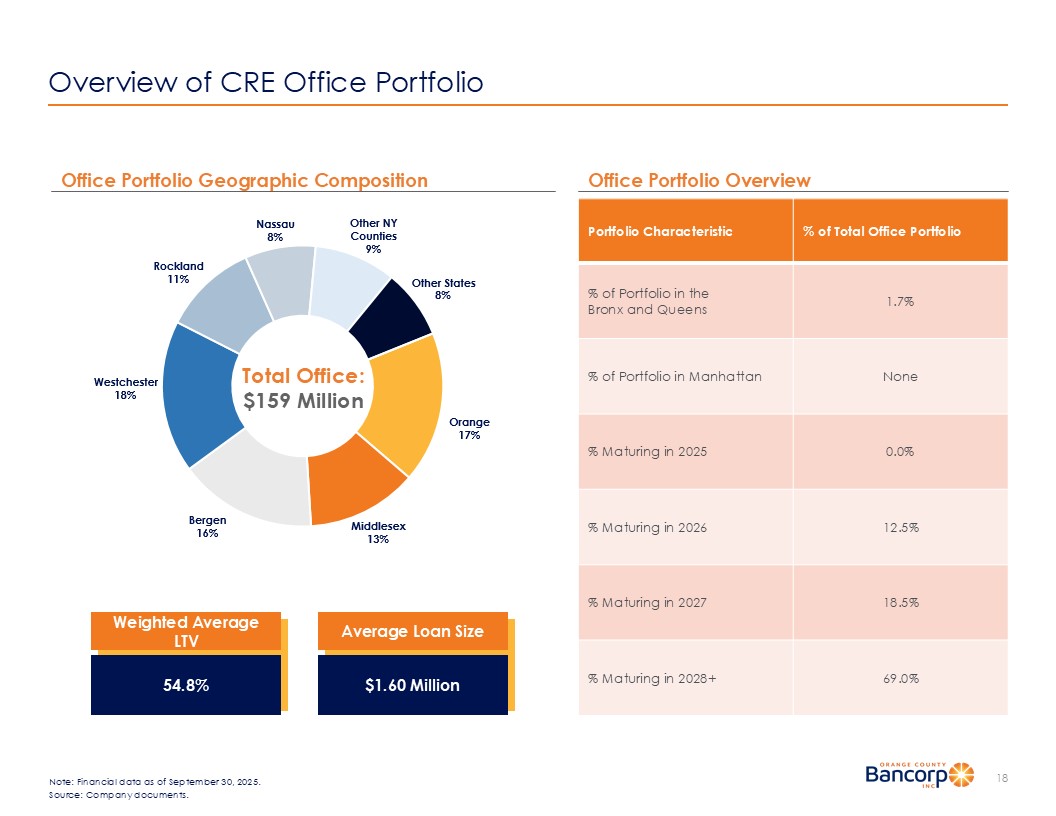 Overview of Multifamily Portfolio 17 Note: Financial data as of September 30, 2025. Source: Company documents. Multifamily Portfolio Detail Multifamily Portfolio Geographic Composition Weighted Average LTV 60.8% Average Loan Size $2.47 Million % of Total Multifamily Portfolio Portfolio Characteristic 24.3% % of Portfolio Rent Stabilized 5.3% % of Portfolio Rent Controlled 1.8% % Maturing in 2025 4.7% % Maturing in 2026 7.1% % Maturing in 2027 86.4% % Maturing in 2028+ %URQ[ :HVWFKHVWHU 2UDQJH 0DQKDWWDQ 5RFNODQG 2WKHU6WDWHV 2WKHU1< &RXQWLHV 1HZ -HUVH\ Total Multi: $425 Million