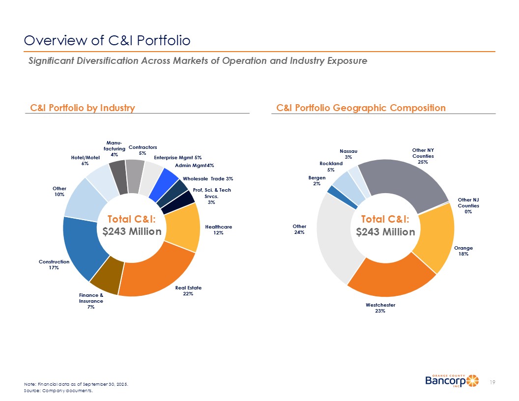 Overview of CRE Office Portfolio 18 Note: Financial data as of September 30, 2025. Source: Company documents. Office Portfolio Overview % of Total Office Portfolio Portfolio Characteristic 1.7% % of Portfolio in the Bronx and Queens None % of Portfolio in Manhattan 0.0% % Maturing in 2025 12.5% % Maturing in 2026 18.5% % Maturing in 2027 69.0% % Maturing in 2028+ Weighted Average LTV 54.8% Average Loan Size $1.60 Million 2UDQJH 0LGGOHVH[ %HUJHQ :HVWFKHVWHU 5RFNODQG 1DVVDX 2WKHU1< &RXQWLHV 2WKHU6WDWHV Total Office: $159 Million Office Portfolio Geographic Composition