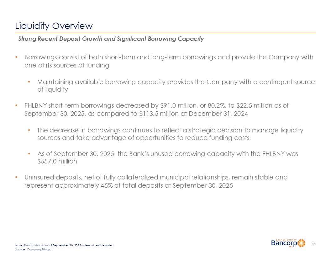 $YJ )HG)XQGV5DWH 2%7 /RFDO3HHUV ó Leading Core Deposit Franchise Areas of Focus Keys to Success x Dedicated deposit relationship managers x Investment into customer experience/cash management product suite x Obtain deposit relationships at loan origination Escrow x Attractive DDA capture Municipal Deposits x Comprise 14% of total deposits x 99% of Municipal Deposits are DDA 21 Low Cost of Total Deposits² Stable and Low - Cost Core Funding Base 1RQ ,QWHUHVW %HDULQJ'HPDQG ,QWHUHVW %HDULQJ 'HPDQG$FFRXQWV 0RQH\0DUNHW 6DYLQJV &HUWLILFDWHVRI'HSRVLW Total Deposits: $2.3 Billion 31.2% Noninterest - Bearing 95.0% Core Deposits¹ 113 bps Cost of Deposits 1) Core deposits defined as total deposits minus certificates of deposit. 2) Cost of total deposits calculated using total annualized deposit interest expense and average total deposits in the given period. 3) Local peers include NASDAQ, NYSE and NYSEAM traded U.S. banks and thrifts in the NYC MSA with total assets less than $50 billion as of 3Q 2025. Excludes merger targets and mutuals. Values reflect median of peer data for respective metrics. Note: Financial data as of or for the nine months ended September 30, 2025 unless otherwise noted. Source: S&P Capital IQ Pro, Company filings, Peer data per S&P Capital IQ Pro.
