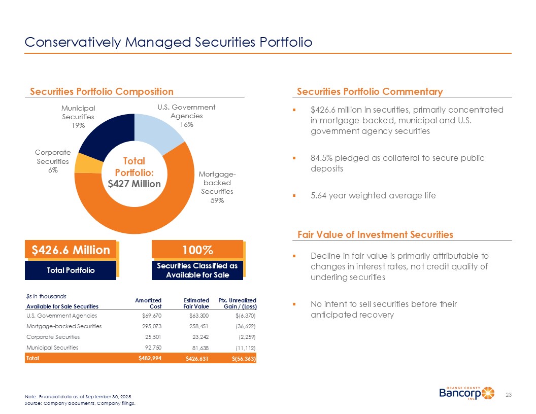 Liquidity Overview 22 Note: Financial data as of September 30, 2025 unless otherwise noted. Source: Company filings. Strong Recent Deposit Growth and Significant Borrowing Capacity • Borrowings consist of both short - term and long - term borrowings and provide the Company with one of its sources of funding • Maintaining available borrowing capacity provides the Company with a contingent source of liquidity • FHLBNY short - term borrowings decreased by $91.0 million, or 80.2%, to $22.5 million as of September 30, 2025, as compared to $113.5 million at December 31, 2024 • The decrease in borrowings continues to reflect a strategic decision to manage liquidity sources and take advantage of opportunities to reduce funding costs. • As of September 30, 2025, the Bank’s unused borrowing capacity with the FHLBNY was $557.0 million • Uninsured deposits, net of fully collateralized municipal relationships, remain stable and represent approximately 45% of total deposits at September 30, 2025