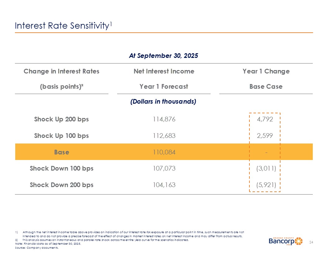 At September 30, 2025 Change in Interest Rates Net Interest Income Year 1 Change (basis points)² Year 1 Forecast Base Case (Dollars in thousands) Shock Up 200 bps 114,876 4,792 Shock Up 100 bps 112,683 2,599 Base 110,084 - Shock Down 100 bps 107,073 (3,011) Shock Down 200 bps 104,163 (5,921) Interest Rate Sensitivity 1 24 1) Although the net interest income table above provides an indication of our interest rate risk exposure at a particular point in time, such measurements are not intended to and do not provide a precise forecast of the effect of changes in market interest rates on net interest income an d m ay differ from actual results. 2) This analysis assumes an instantaneous and parallel rate shock across the entire yield curve for the scenarios indicated. Note: Financial data as of September 30, 2025. Source: Company documents.