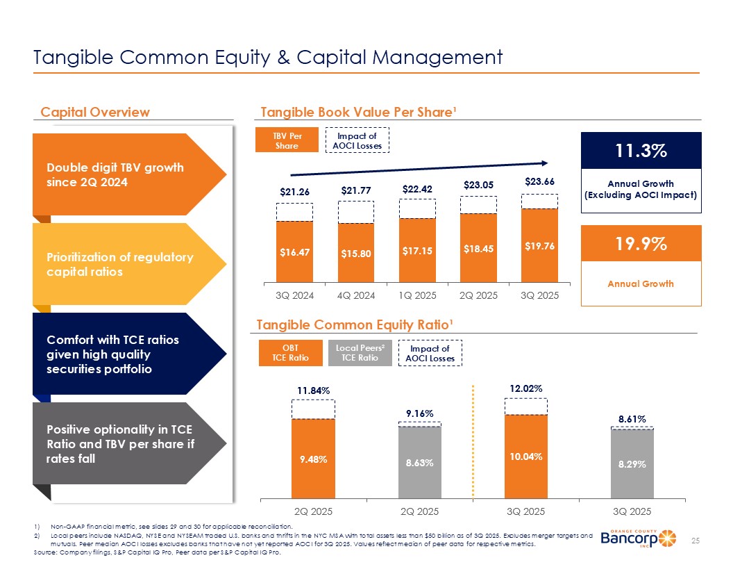 Tangible Common Equity Ratios (Quarterly) As of the Quarter Ended June 30, 2024 September 30, 2024 December 31, 2024 March 31, 2025 September 30, 2025 Total Common Equity $177,544 $193,094 $185,531 $201,324 $270,120 Goodwill 5,359 5,359 5,359 5,359 5,359 Other Intangibles 964 892 821 750 607 Less: Total Intangible Assets 6,323 6,251 6,180 6,109 5,966 Tangible Common Equity $171,221 $186,843 $179,351 $195,215 $264,154 Total Assets $2,481,157 $2,519,099 $2,509,927 $2,560,128 $2,636,450 Goodwill 5,359 5,359 5,359 5,359 5,359 Other Intangibles 964 892 821 750 607 Less: Total Intangible Assets 6,323 6,251 6,180 6,109 5,966 Tangible Assets $2,474,834 $2,512,848 $2,503,747 $2,554,019 $2,630,484 Tangible Common Equity / Tangible Assets 6.92% 7.44% 7.16% 7.64% 10.04% Acc. Other Comprehensive Income (67,433) (54,386) (67,751) (60,019) (52,151) TCE Ex. AOCI 9.64% 9.60% 9.87% 9.99% 12.02% Reconciliation of GAAP to Non - GAAP Financial Measures (Continued) 30 Note: Dollars in thousands. Source: Company filings.