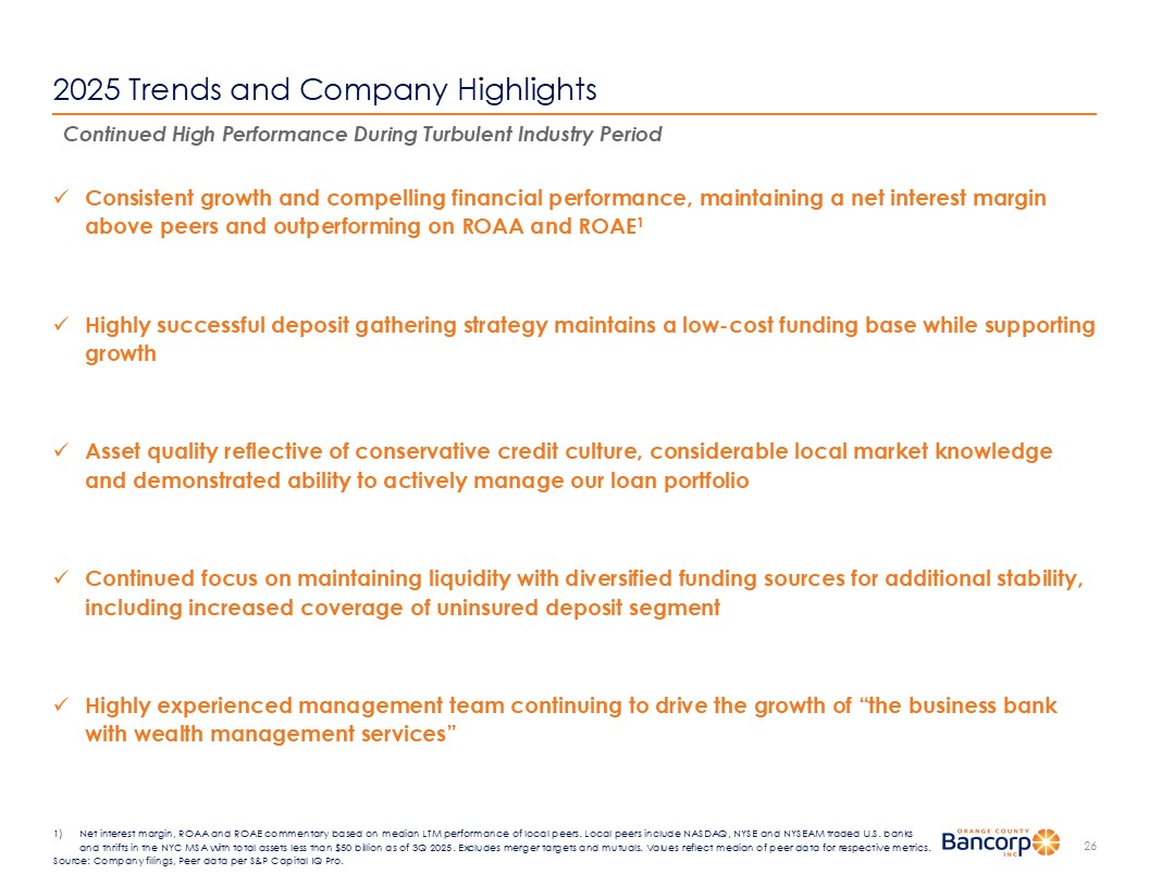 4 4 4 4 Tangible Common Equity & Capital Management 25 Tangible Common Equity Ratio¹ Capital Overview 1) Non - GAAP financial metric, see slides 29 and 30 for applicable reconciliation. 2) Local peers include NASDAQ, NYSE and NYSEAM traded U.S. banks and thrifts in the NYC MSA with total assets less than $50 bill ion as of 3Q 2025. Excludes merger targets and mutuals. Peer median AOCI losses excludes banks that have not yet reported AOCI for 3Q 2025. Values reflect median of peer da ta for respective metrics. Source: Company filings, S&P Capital IQ Pro, Peer data per S&P Capital IQ Pro. Tangible Book Value P er Share¹ 4 4 4 4 4 OBT TCE Ratio Impact of AOCI Losses Local Peers² TCE Ratio TBV Per Share Impact of AOCI Losses Double digit TBV growth since 2 Q 2024 Prioritization of regulatory capital ratios Comfort with TCE ratios given high quality securities portfolio Positive optionality in TCE Ratio and TBV per share if rates fall 11 .3% Annual Growth (Excluding AOCI Impact) 19.9 % Annual Growth
