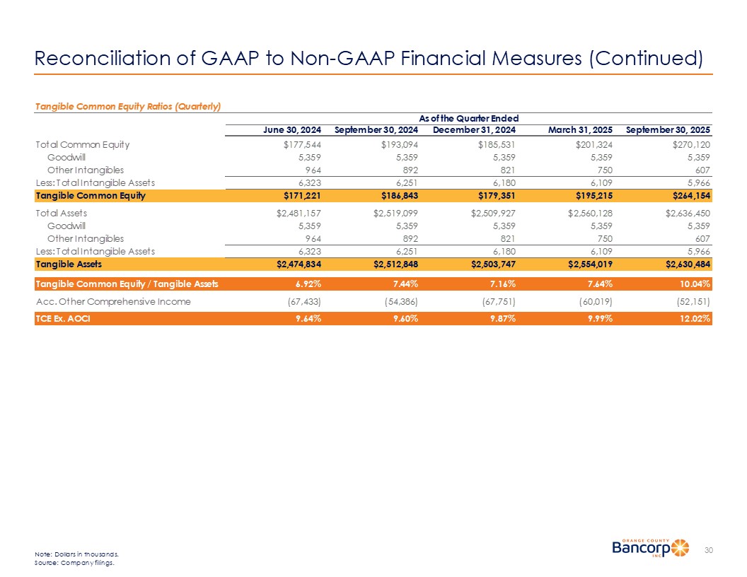 Tangible Common Equity Ratios As of the Year Ended December 31, As of the 9-Months 2021 2022 2023 2024 Ended Sept. 30, 2025 Total Common Equity $182,836 $138,138 $165,376 $185,531 $270,120 Goodwill 5,359 5,359 5,359 5,359 5,359 Other Intangibles 1,678 1,392 1,107 821 607 Less: Total Intangible Assets 7,037 6,751 6,466 6,180 5,966 Tangible Common Equity $175,799 $131,387 $158,910 $179,351 $264,154 Total Assets $2,142,583 $2,287,334 $2,485,468 $2,509,927 $2,636,450 Goodwill 5,359 5,359 5,359 5,359 5,359 Other Intangibles 1,678 1,392 1,107 821 607 Less: Total Intangible Assets 7,037 6,751 6,466 6,180 5,966 Tangible Assets $2,135,546 $2,280,583 $2,479,002 $2,503,747 $2,630,484 Tangible Common Equity / Tangible Assets 8.23% 5.76% 6.41% 7.16% 10.04% Acc. Other Comprehensive Income (3,443) (68,196) (64,108) (67,751) (52,151) TCE Ex. AOCI 8.39% 8.75% 9.00% 9.87% 12.02% Efficiency Ratio For the Year Ended December 31, For the 9-Months 2021 2022 2023 2024 Ended Sept. 30, 2025 GAAP-based Efficiency Ratio 59.9% 55.8% 55.8% 60.5% 56.1% Net interest Income 60,461 78,088 88,391 91,766 75,715 Noninterest Income 12,102 11,996 13,312 15,972 18,460 Pre-Provision Revenue $72,563 $90,084 $101,703 $107,738 $94,175 Less: Net Gains on Sale of Securities – – 107 – (568) Less: Proceeds from BOLI Benefit – – – – 3,590 Less: Gain on Branch Sale – – – – 1,236 Adjusted Revenue $72,563 $90,084 $101,596 $107,738 $89,917 Total Noninterest Expense 43,458 50,290 56,793 65,210 50,089 Efficiency Ratio, Adjusted 59.9% 55.8% 55.9% 60.5% 55.7% Reconciliation of GAAP to Non - GAAP Financial Measures 29 Note: Dollars in thousands. Source: Company filings.