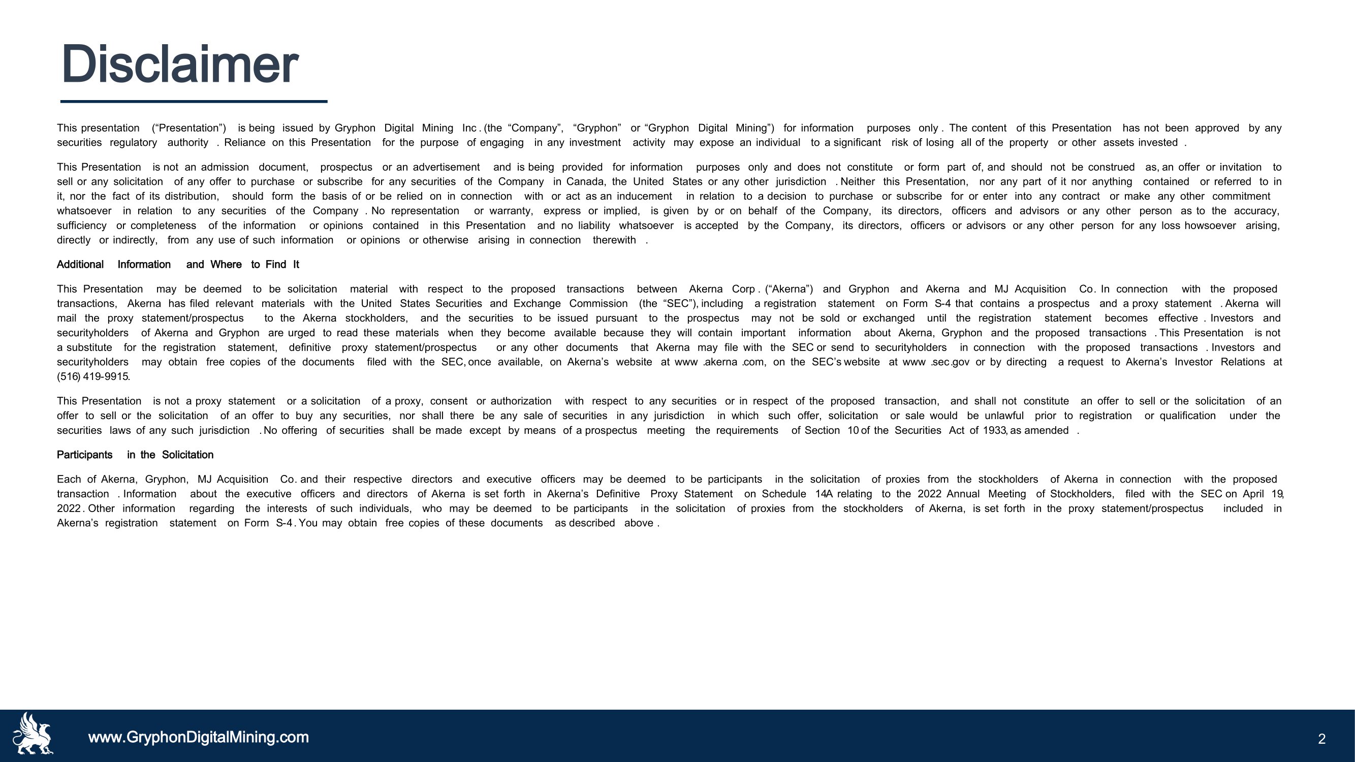 www.GryphonDigitalMining.com Disclaimer This presentation (“Presentation”) is being issued by Gryphon Digital Mining Inc . (the “Company”, “Gryphon” or “Gryphon Digital Mining”) for information purposes only . The content of this Presentation has not been approved by any securities regulatory authority . Reliance on this Presentation for the purpose of engaging in any investment activity may expose an individual to a significant risk of losing all of the property or other assets invested . This Presentation is not an admission document, prospectus or an advertisement and is being provided for information purposes only and does not constitute or form part of, and should not be construed as, an offer or invitation to sell or any solicitation of any offer to purchase or subscribe for any securities of the Company in Canada, the United States or any other jurisdiction . Neither this Presentation, nor any part of it nor anything contained or referred to in it, nor the fact of its distribution, should form the basis of or be relied on in connection with or act as an inducement in relation to a decision to purchase or subscribe for or enter into any contract or make any other commitment whatsoever in relation to any securities of the Company . No representation or warranty, express or implied, is given by or on behalf of the Company, its directors, officers and advisors or any other person as to the accuracy, sufficiency or completeness of the information or opinions contained in this Presentation and no liability whatsoever is accepted by the Company, its directors, officers or advisors or any other person for any loss howsoever arising, directly or indirectly, from any use of such information or opinions or otherwise arising in connection therewith . Additional Information and Where to Find It This Presentation may be deemed to be solicitation material with respect to the proposed transactions between Akerna Corp . (“Akerna”) and Gryphon and Akerna and MJ Acquisition Co . In connection with the proposed transactions, Akerna has filed relevant materials with the United States Securities and Exchange Commission (the “SEC”), including a registration statement on Form S - 4 that contains a prospectus and a proxy statement . Akerna will mail the proxy statement/prospectus to the Akerna stockholders, and the securities to be issued pursuant to the prospectus may not be sold or exchanged until the registration statement becomes effective . Investors and securityholders of Akerna and Gryphon are urged to read these materials when they become available because they will contain important information about Akerna, Gryphon and the proposed transactions . This Presentation is not a substitute for the registration statement, definitive proxy statement/prospectus or any other documents that Akerna may file with the SEC or send to securityholders in connection with the proposed transactions . Investors and securityholders may obtain free copies of the documents filed with the SEC, once available, on Akerna’s website at www . akerna . com, on the SEC’s website at www . sec . gov or by directing a request to Akerna’s Investor Relations at ( 516 ) 419 - 9915 . This Presentation is not a proxy statement or a solicitation of a proxy, consent or authorization with respect to any securities or in respect of the proposed transaction, and shall not constitute an offer to sell or the solicitation of an offer to sell or the solicitation of an offer to buy any securities, nor shall there be any sale of securities in any jurisdiction in which such offer, solicitation or sale would be unlawful prior to registration or qualification under the securities laws of any such jurisdiction . No offering of securities shall be made except by means of a prospectus meeting the requirements of Section 10 of the Securities Act of 1933 , as amended . Participants in the Solicitation Each of Akerna, Gryphon, MJ Acquisition Co . and their respective directors and executive officers may be deemed to be participants in the solicitation of proxies from the stockholders of Akerna in connection with the proposed transaction . Information about the executive officers and directors of Akerna is set forth in Akerna’s Definitive Proxy Statement on Schedule 14 A relating to the 2022 Annual Meeting of Stockholders, filed with the SEC on April 19 , 2022 . Other information regarding the interests of such individuals, who may be deemed to be participants in the solicitation of proxies from the stockholders of Akerna, is set forth in the proxy statement/prospectus included in Akerna’s registration statement on Form S - 4 . You may obtain free copies of these documents as described above . 2