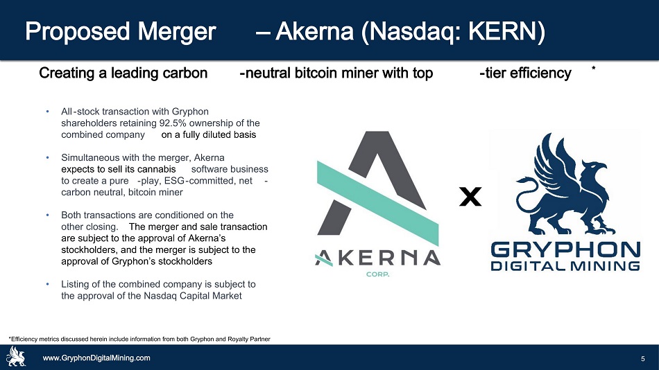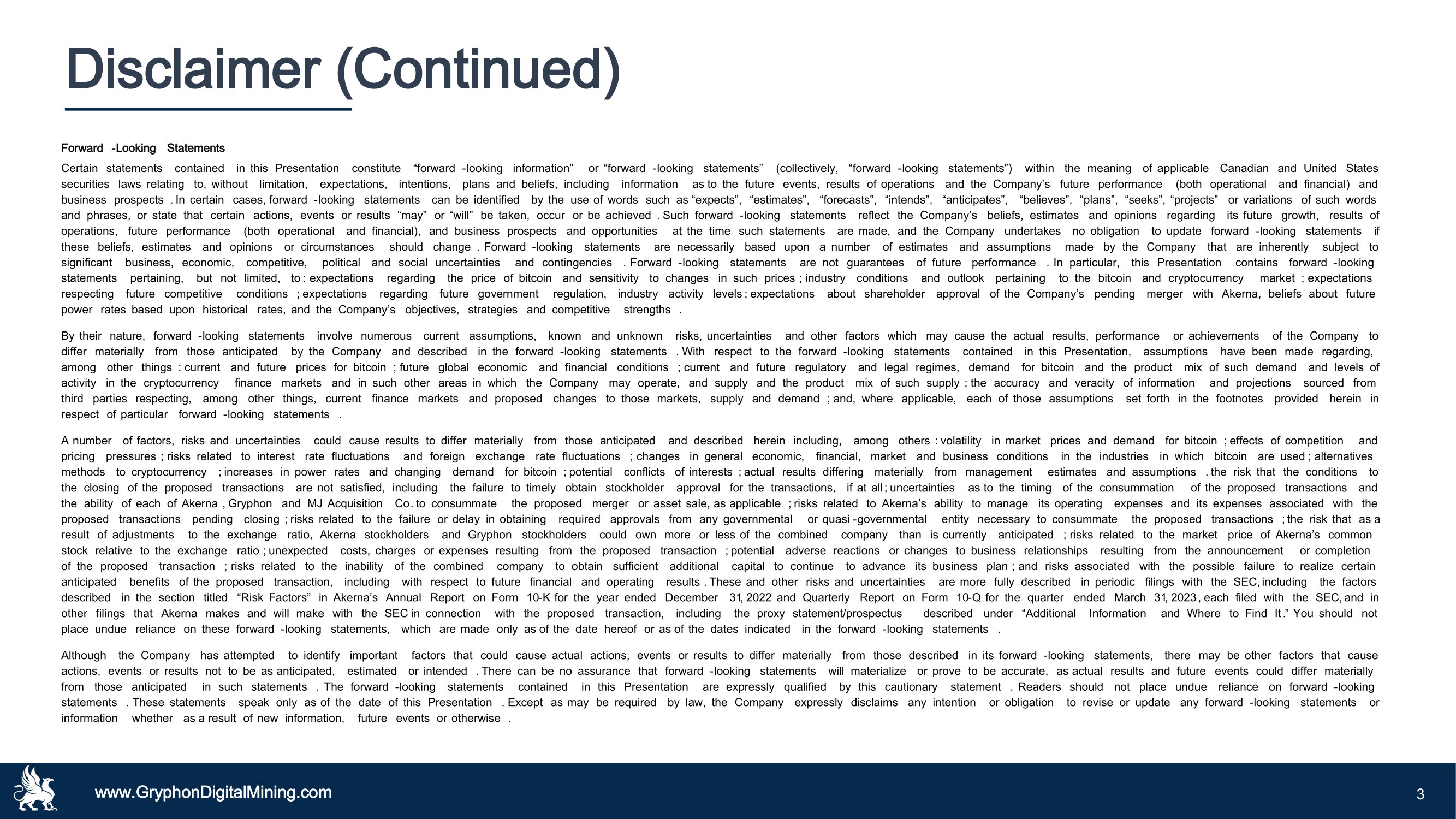 www.GryphonDigitalMining.com Disclaimer (Continued) Forward - Looking Statements Certain statements contained in this Presentation constitute “forward - looking information” or “forward - looking statements” (collectively, “forward - looking statements”) within the meaning of applicable Canadian and United States securities laws relating to, without limitation, expectations, intentions, plans and beliefs, including information as to the future events, results of operations and the Company’s future performance (both operational and financial) and business prospects . In certain cases, forward - looking statements can be identified by the use of words such as “expects”, “estimates”, “forecasts”, “intends”, “anticipates”, “believes”, “plans”, “seeks”, “projects” or variations of such words and phrases, or state that certain actions, events or results “may” or “will” be taken, occur or be achieved . Such forward - looking statements reflect the Company’s beliefs, estimates and opinions regarding its future growth, results of operations, future performance (both operational and financial), and business prospects and opportunities at the time such statements are made, and the Company undertakes no obligation to update forward - looking statements if these beliefs, estimates and opinions or circumstances should change . Forward - looking statements are necessarily based upon a number of estimates and assumptions made by the Company that are inherently subject to significant business, economic, competitive, political and social uncertainties and contingencies . Forward - looking statements are not guarantees of future performance . In particular, this Presentation contains forward - looking statements pertaining, but not limited, to : expectations regarding the price of bitcoin and sensitivity to changes in such prices ; industry conditions and outlook pertaining to the bitcoin and cryptocurrency market ; expectations respecting future competitive conditions ; expectations regarding future government regulation, industry activity levels ; expectations about shareholder approval of the Company’s pending merger with Akerna, beliefs about future power rates based upon historical rates, and the Company’s objectives, strategies and competitive strengths . By their nature, forward - looking statements involve numerous current assumptions, known and unknown risks, uncertainties and other factors which may cause the actual results, performance or achievements of the Company to differ materially from those anticipated by the Company and described in the forward - looking statements . With respect to the forward - looking statements contained in this Presentation, assumptions have been made regarding, among other things : current and future prices for bitcoin ; future global economic and financial conditions ; current and future regulatory and legal regimes, demand for bitcoin and the product mix of such demand and levels of activity in the cryptocurrency finance markets and in such other areas in which the Company may operate, and supply and the product mix of such supply ; the accuracy and veracity of information and projections sourced from third parties respecting, among other things, current finance markets and proposed changes to those markets, supply and demand ; and, where applicable, each of those assumptions set forth in the footnotes provided herein in respect of particular forward - looking statements . A number of factors, risks and uncertainties could cause results to differ materially from those anticipated and described herein including, among others : volatility in market prices and demand for bitcoin ; effects of competition and pricing pressures ; risks related to interest rate fluctuations and foreign exchange rate fluctuations ; changes in general economic, financial, market and business conditions in the industries in which bitcoin are used ; alternatives methods to cryptocurrency ; increases in power rates and changing demand for bitcoin ; potential conflicts of interests ; actual results differing materially from management estimates and assumptions . the risk that the conditions to the closing of the proposed transactions are not satisfied, including the failure to timely obtain stockholder approval for the transactions, if at all ; uncertainties as to the timing of the consummation of the proposed transactions and the ability of each of Akerna , Gryphon and MJ Acquisition Co . to consummate the proposed merger or asset sale, as applicable ; risks related to Akerna’s ability to manage its operating expenses and its expenses associated with the proposed transactions pending closing ; risks related to the failure or delay in obtaining required approvals from any governmental or quasi - governmental entity necessary to consummate the proposed transactions ; the risk that as a result of adjustments to the exchange ratio, Akerna stockholders and Gryphon stockholders could own more or less of the combined company than is currently anticipated ; risks related to the market price of Akerna’s common stock relative to the exchange ratio ; unexpected costs, charges or expenses resulting from the proposed transaction ; potential adverse reactions or changes to business relationships resulting from the announcement or completion of the proposed transaction ; risks related to the inability of the combined company to obtain sufficient additional capital to continue to advance its business plan ; and risks associated with the possible failure to realize certain anticipated benefits of the proposed transaction, including with respect to future financial and operating results . These and other risks and uncertainties are more fully described in periodic filings with the SEC, including the factors described in the section titled “Risk Factors” in Akerna’s Annual Report on Form 10 - K for the year ended December 31 , 2022 and Q
