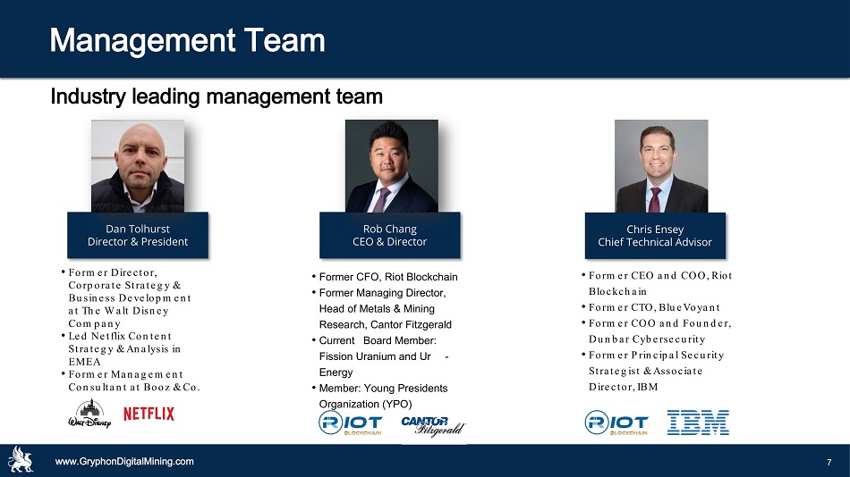www.GryphonDigitalMining.com Target Capitalization • Net Carbon Neutral miner pursuing a negative carbon strategy with the acquisition of carbon offset credits and with mining operations that use carbon - neutral energy • Top - tier Bitcoin Efficiency of 90 BTC - equivalent per EH in April vs. 70 per EH peer average**. Placed at or tied for 1st among peers in 9 out of the last 12 - month period • CEO & Director, Rob Chang, previously served as CFO of Riot Blockchain and as MD at Cantor Fitzgerald • Chairperson, Brittany Kaiser, globally - renowned expert in blockchain technology and digital assets • Chief Technical Advisor, Chris Ensey, is the former CEO & COO of Riot Blockchain and has overseen development of +100 MW mining operations • Up to 1.2 Exahash of combined hashrate • 0.86 exahash of self mining • 0.34 exahash via a 22.5% gross profit royalty with third - party bitcoin miner • Breakeven Cost per BTC ~$14,712/BTC* • Expected to decline as royalty grows 6 Creating an industry leader in bitcoin mining. Size & Scale Leadership Team ESG Investment Highlights *Based on FY 2022 ** Among publicly reporting peers