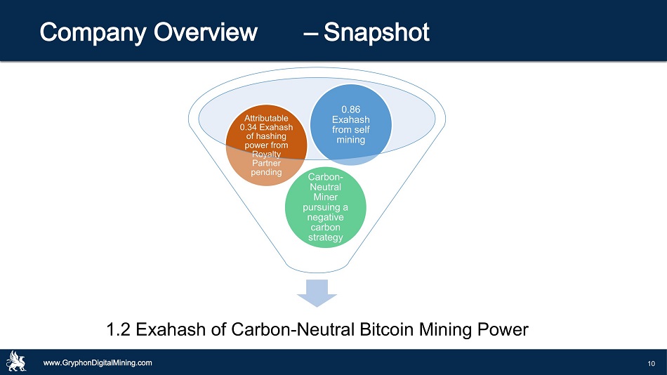 www.GryphonDigitalMining.com Target Capitalization 9 Unparalleled Growth in Just Over 2 Short Years Company Overview - History October 2020 : Company Founded April 2021 : Purchased 7,200 S19j Pro miners from Bitmain June 2021 : Hosting agreement signed with CoinMint LLC for 23 MW of carbon - neutral energy August 2021 : Gryphon secures a 22.5% Net Operating Profit Royalty with a third - party bitcoin miner on all of its blockchain operations September 2021 : First machines deployed and generating bitcoin Jan/Feb/Mar/ May/Jul/Aug/ Sept/Nov/Dec : Gryphon ranks at or tied for first in bitcoin efficiency vs. publicly disclosing peers December 2022 : Gryphon achieves self mining hashrate of 0.72 EH/s as royalty partner begins operations January 2023 : Gryphon announces proposed merger with Akerna ( KERN:Nasdaq )