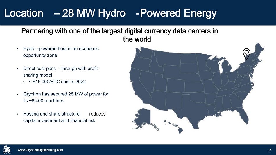 www.GryphonDigitalMining.com Target Capitalization 10 Company Overview – Snapshot 1.2 Exahash of Carbon - Neutral Bitcoin Mining Power Carbon - Neutral Miner pursuing a negative carbon strategy Attributable 0.34 Exahash of hashing power from Royalty Partner pending 0.86 Exahash from self mining