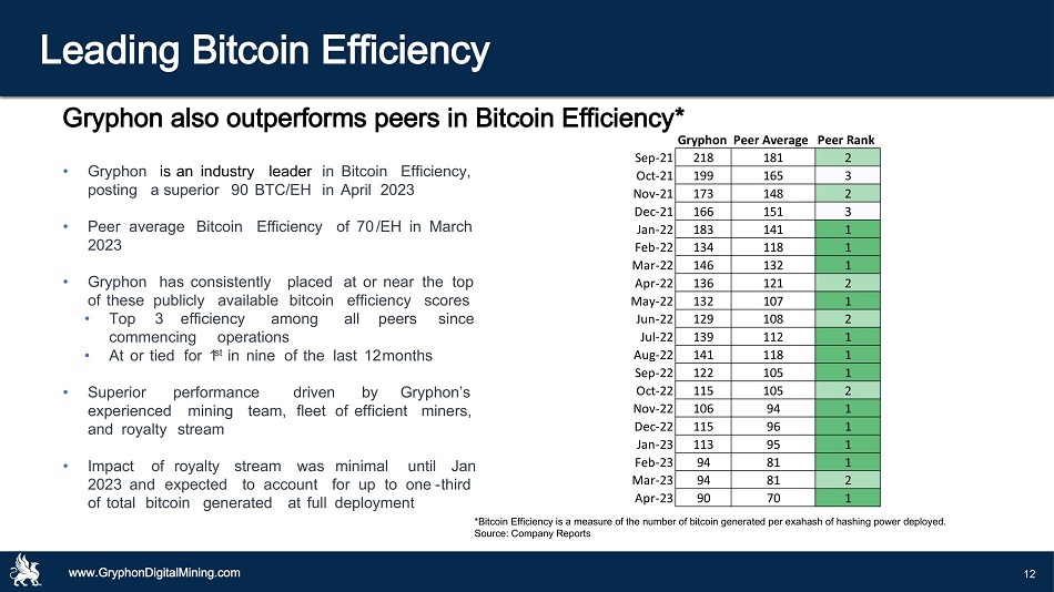 www.GryphonDigitalMining.com Target Capitalization • Hydro - powered host in an economic opportunity zone • Direct cost pass - through with profit sharing model • < $15,000/BTC cost in 2022 • Gryphon has secured 28 MW of power for its ~8,400 machines • Hosting and share structure reduces capital investment and financial risk 11 Partnering with one of the largest digital currency data centers in the world Location – 28 MW Hydro - Powered Energy