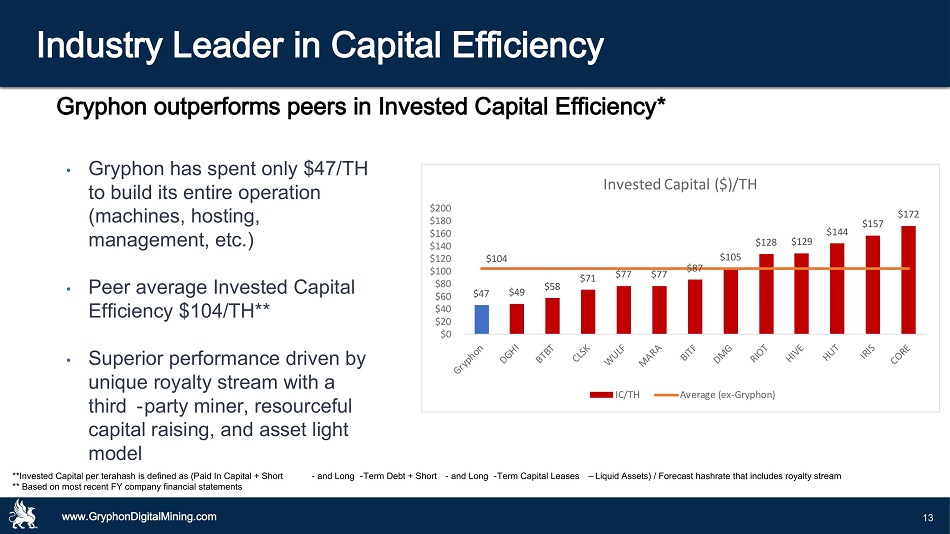 www.GryphonDigitalMining.com Target Capitalization • Gryphon is an industry leader in Bitcoin Efficiency, posting a superior 90 BTC/EH in April 2023 • Peer average Bitcoin Efficiency of 70 /EH in March 2023 • Gryphon has consistently placed at or near the top of these publicly available bitcoin efficiency scores • Top 3 efficiency among all peers since commencing operations • At or tied for 1 st in nine of the last 12 months • Superior performance driven by Gryphon’s experienced mining team, fleet of efficient miners, and royalty stream • Impact of royalty stream was minimal until Jan 2023 and expected to account for up to one - third of total bitcoin generated at full deployment 12 Gryphon also outperforms peers in Bitcoin Efficiency* Leading Bitcoin Efficiency *Bitcoin Efficiency is a measure of the number of bitcoin generated per exahash of hashing power deployed. Source: Company Reports GryphonPeer Average Peer Rank Sep-21 218 181 2 Oct-21 199 165 3 Nov-21 173 148 2 Dec-21 166 151 3 Jan-22 183 141 1 Feb-22 134 118 1 Mar-22 146 132 1 Apr-22 136 121 2 May-22 132 107 1 Jun-22 129 108 2 Jul-22 139 112 1 Aug-22 141 118 1 Sep-22 122 105 1 Oct-22 115 105 2 Nov-22 106 94 1 Dec-22 115 96 1 Jan-23 113 95 1 Feb-23 94 81 1 Mar-23 94 81 2 Apr-23 90 70 1