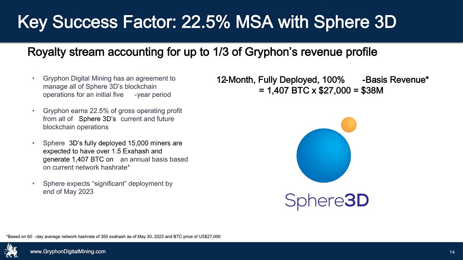 www.GryphonDigitalMining.com Target Capitalization • Gryphon has spent only $47/TH to build its entire operation (machines, hosting, management, etc.) • Peer average Invested Capital Efficiency $104/TH** • Superior performance driven by unique royalty stream with a third - party miner, resourceful capital raising, and asset light model 13 Gryphon outperforms peers in Invested Capital Efficiency* Industry Leader in Capital Efficiency **Invested Capital per terahash is defined as (Paid In Capital + Short - and Long - Term Debt + Short - and Long - Term Capital Leases – Liquid Assets) / Forecast hashrate that includes royalty stream ** Based on most recent FY company financial statements $47 $49 $58 $71 $77 $77 $87 $105 $128 $129 $144 $157 $172 $104 $0 $20 $40 $60 $80 $100 $120 $140 $160 $180 $200 Invested Capital ($)/TH IC/TH Average (ex-Gryphon)