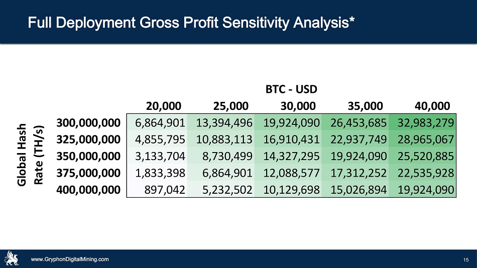www.GryphonDigitalMining.com Target Capitalization • Gryphon Digital Mining has an agreement to manage all of Sphere 3D’s blockchain operations for an initial five - year period • Gryphon earns 22.5% of gross operating profit from all of Sphere 3D’s current and future blockchain operations • Sphere 3D’s fully deployed 15,000 miners are expected to have over 1.5 Exahash and generate 1,407 BTC on an annual basis based on current network hashrate* • Sphere expects “significant” deployment by end of May 2023 14 Royalty stream accounting for up to 1/3 of Gryphon’s revenue profile Key Success Factor: 22.5% MSA with Sphere 3D 12 - Month, Fully Deployed, 100% - Basis Revenue* = 1,407 BTC x $27,000 = $38M *Based on 60 - day average network hashrate of 350 exahash as of May 30, 2023 and BTC price of US$27,000