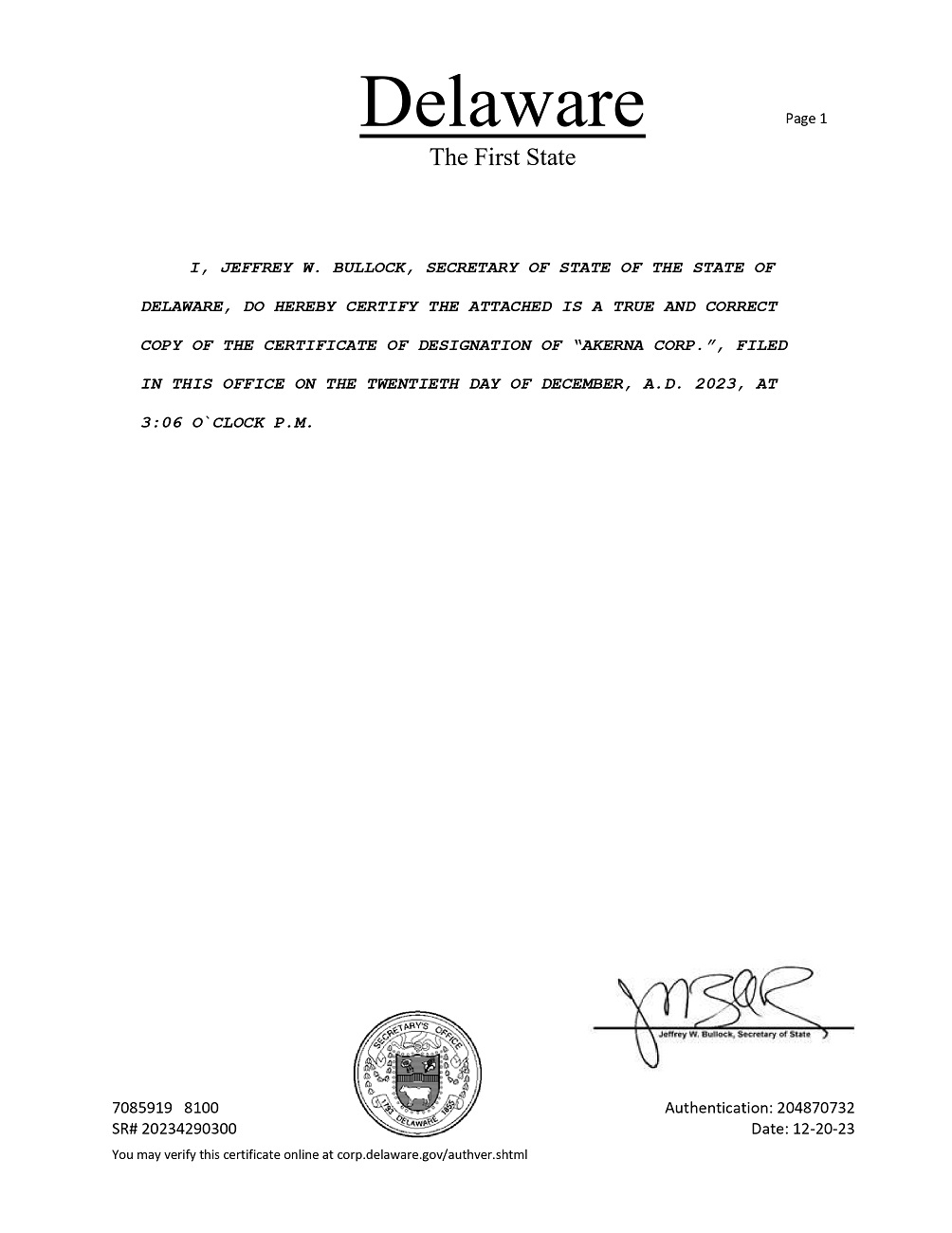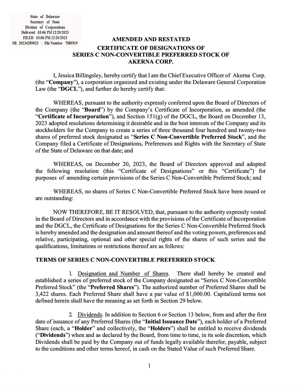 EX-3.1 2 ea190592ex3-1_akerna.htm AMENDED AND RESTATED CERTIFICATE OF DESIGNATIONS OF PREFERENCES, RIGHTS AND LIMITATIONS OF SERIES C PREFERRED STOCK