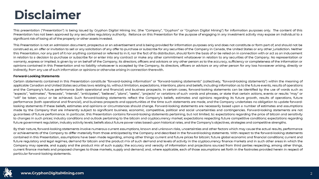 www.GryphonDigitalMining.com Disclaimer This presentation (“Presentation”) is being issued by Gryphon Digital Mining Inc . (the “Company”, “Gryphon” or “Gryphon Digital Mining”) for information purposes only . The content of this Presentation has not been approved by any securities regulatory authority . Reliance on this Presentation for the purpose of engaging in any investment activity may expose an individual to a significant risk of losing all of the property or other assets invested . This Presentation is not an admission document, prospectus or an advertisement and is being provided for information purposes only and does not constitute or form part of, and should not be construed as, an offer or invitation to sell or any solicitation of any offer to purchase or subscribe for any securities of the Company in Canada, the United States or any other jurisdiction . Neither this Presentation, nor any part of it nor anything contained or referred to in it, nor the fact of its distribution, should form the basis of or be relied on in connection with or act as an inducement in relation to a decision to purchase or subscribe for or enter into any contract or make any other commitment whatsoever in relation to any securities of the Company . No representation or warranty, express or implied, is given by or on behalf of the Company, its directors, officers and advisors or any other person as to the accuracy, sufficiency or completeness of the information or opinions contained in this Presentation and no liability whatsoever is accepted by the Company, its directors, officers or advisors or any other person for any loss howsoever arising, directly or indirectly, from any use of such information or opinions or otherwise arising in connection therewith . Forward - Looking Statements Certain statements contained in this Presentation constitute “forward - looking information” or “forward - looking statements” (collectively, “forward - looking statements”) within the meaning of applicable Canadian and United States securities laws relating to, without limitation, expectations, intentions, plans and beliefs, including information as to the future events, results of operations and the Company’s future performance (both operational and financial) and business prospects . In certain cases, forward - looking statements can be identified by the use of words such as “expects”, “estimates”, “forecasts”, “intends”, “anticipates”, “believes”, “plans”, “seeks”, “projects” or variations of such words and phrases, or state that certain actions, events or results “may” or “will” be taken, occur or be achieved . Such forward - looking statements reflect the Company’s beliefs, estimates and opinions regarding its future growth, results of operations, future performance (both operational and financial), and business prospects and opportunities at the time such statements are made, and the Company undertakes no obligation to update forward - looking statements if these beliefs, estimates and opinions or circumstances should change . Forward - looking statements are necessarily based upon a number of estimates and assumptions made by the Company that are inherently subject to significant business, economic, competitive, political and social uncertainties and contingencies . Forward - looking statements are not guarantees of future performance . In particular, this Presentation contains forward - looking statements pertaining, but not limited, to : expectations regarding the price of bitcoin and sensitivity to changes in such prices ; industry conditions and outlook pertaining to the bitcoin and cryptocurrency market ; expectations respecting future competitive conditions ; expectations regarding future government regulation, industry activity levels ; beliefs about future power rates based upon historical rates, and the Company’s objectives, strategies and competitive strengths . By their nature, forward - looking statements involve numerous current assumptions, known and unknown risks, uncertainties and other factors which may cause the actual results, performance or achievements of the Company to differ materially from those anticipated by the Company and described in the forward - looking statements . With respect to the forward - looking statements contained in this Presentation, assumptions have been made regarding, among other things : current and future prices for bitcoin ; future global economic and financial conditions ; current and future regulatory and legal regimes, demand for bitcoin and the product mix of such demand and levels of activity in the cryptocurrency finance markets and in such other areas in which the Company may operate, and supply and the product mix of such supply ; the accuracy and veracity of information and projections sourced from third parties respecting, among other things, current finance markets and proposed changes to those markets, supply and demand ; and, where applicable, each of those assumptions set forth in the footnotes provided herein in respect of particular forward - looking statements . 2