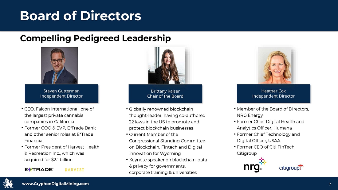 www.GryphonDigitalMining.com Target Capitalization • Former CFO, Riot Blockchain • Former Managing Director, Head of Metals & Mining Research, Cantor Fitzgerald • Current Board Member: Fission Uranium and Ur - Energy • Member: Young Presidents Organization (YPO) 6 Industry leading management team Rob Chang CEO & Director • Former CEO and COO, Riot Blockchain • Former CTO, BlueVoyant • Former COO and Founder, Dunbar Cybersecurity • Former Principal Security Strategist & Associate Director, IBM Chris Ensey Chief Technical Advisor Management Team • Former CFO, Marathon Digital Holdings • Oversaw market cap growth from $500 million to $8 billion over 12 months • Former CFO, Las Vegas Monorail Company • Former Senior Auditor, BDO & RSM Sim Salzman CFO