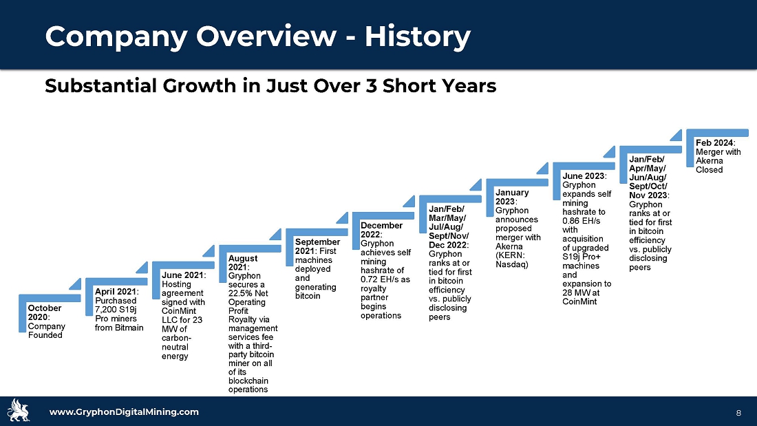 www.GryphonDigitalMining.com Disclaimer A number of factors, risks and uncertainties could cause results to differ materially from those anticipated and described herein including, among others : volatility in market prices and demand for bitcoin ; effects of competition and pricing pressures ; risks related to interest rate fluctuations and foreign exchange rate fluctuations ; changes in general economic, financial, market and business conditions in the industries in which bitcoin are used ; alternatives methods to cryptocurrency ; increases in power rates and changing demand for bitcoin ; potential conflicts of interests ; actual results differing materially from management estimates and assumptions . These and other risks and uncertainties are more fully described in periodic filings with the SEC, including the Registration Statement on Form S - 4 filed by Akerna Corp . (File No . 333 - 271857 ) . You should not place undue reliance on these forward - looking statements, which are made only as of the date hereof or as of the dates indicated in the forward - looking statements . Although the Company has attempted to identify important factors that could cause actual actions, events or results to differ materially from those described in its forward - looking statements, there may be other factors that cause actions, events or results not to be as anticipated, estimated or intended . There can be no assurance that forward - looking statements will materialize or prove to be accurate, as actual results and future events could differ materially from those anticipated in such statements . The forward - looking statements contained in this Presentation are expressly qualified by this cautionary statement . Readers should not place undue reliance on forward - looking statements . These statements speak only as of the date of this Presentation . Except as may be required by law, the Company expressly disclaims any intention or obligation to revise or update any forward - looking statements or information whether as a result of new information, future events or otherwise . Trademarks This presentation includes trademarks of Gryphon, which are protected under applicable intellectual property laws and are the property of Gryphon or its subsidiaries . This presentation also includes other trademarks, trade names and service marks that are the property of their respective owners . Solely for convenience, in some cases, the trademarks, trade names and service marks referred to in this proxy statement/prospectus are listed without the applicable ®, and SM symbols, but they will assert, to the fullest extent under applicable law, their rights to these trademarks, trade names and service marks . 3