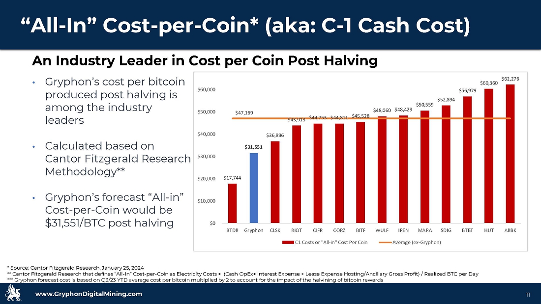 www.GryphonDigitalMining.com Target Capitalization • Hydro - powered host in an economic opportunity zone • Direct cost pass - through with profit sharing model • ~ $15,746/BTC cost* • Gryphon has secured 28 MW of power for its ~9,000 machines • Hosting and share structure reduces capital investment and financial risk 10 Partnering with one of the largest digital currency data centers in the world Location – 28 MW Hydro - Powered Energy *Based on YTD through Sept 30, 2023