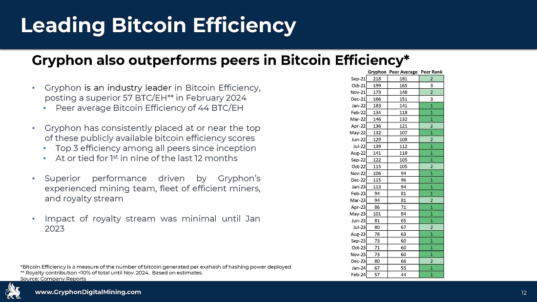 www.GryphonDigitalMining.com Target Capitalization • Gryphon’s cost per bitcoin produced post halving is among the industry leaders • Calculated based on Cantor Fitzgerald Research Methodology** • Gryphon’s forecast “All - in” Cost - per - Coin would be $31,551/BTC post halving 11 An Industry Leader in Cost per Coin Post Halving “All - In” Cost - per - Coin* (aka: C - 1 Cash Cost) * Source: Cantor Fitzgerald Research, January 25, 2024 ** Cantor Fitzgerald Research that defines “All - In” Cost - per - Coin as Electricity Costs + (Cash OpEx + Interest Expense + Lease Expense Hosting/Ancillary Gross Profit) / Realized BTC per Day *** Gryphon forecast cost is based on Q3/23 YTD average cost per bitcoin multiplied by 2 to account for the impact of the halvining of bitcoin rewards $17,744 $31,551 $36,896 $43,913 $44,753 $44,811 $45,528 $48,060 $48,429 $50,559 $52,894 $56,979 $60,360 $62,276 $47,169 $0 $10,000 $20,000 $30,000 $40,000 $50,000 $60,000 BTDR Gryphon CLSK RIOT CIFR CORZ BITF WULF IREN MARA SDIG BTBT HUT ARBK C1 Costs or "All-in" Cost Per Coin Average (ex-Gryphon)