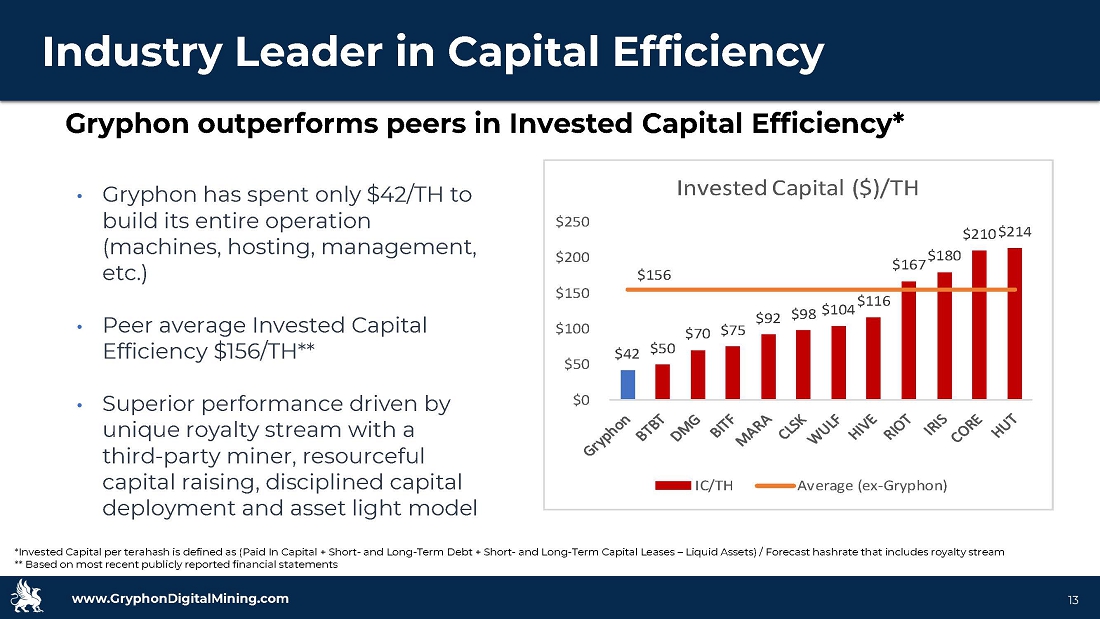 www.GryphonDigitalMining.com Target Capitalization • Gryphon is an industry leader in Bitcoin Efficiency, posting a superior 57 BTC/EH** in February 2024 • Peer average Bitcoin Efficiency of 44 BTC/EH • Gryphon has consistently placed at or near the top of these publicly available bitcoin efficiency scores • Top 3 efficiency among all peers since inception • At or tied for 1 st in nine of the last 12 months • Superior performance driven by Gryphon’s experienced mining team, fleet of efficient miners, and royalty stream • Impact of royalty stream was minimal until Jan 2023 12 Gryphon also outperforms peers in Bitcoin Efficiency* Leading Bitcoin Efficiency *Bitcoin Efficiency is a measure of the number of bitcoin generated per exahash of hashing power deployed ** Royalty contribution <10% of total until Nov. 2024. Based on estimates. Source: Company Reports GryphonPeer Average Peer Rank Sep-21 218 181 2 Oct-21 199 165 3 Nov-21 173 148 2 Dec-21 166 151 3 Jan-22 183 141 1 Feb-22 134 118 1 Mar-22 146 132 1 Apr-22 136 121 2 May-22 132 107 1 Jun-22 129 108 2 Jul-22 139 112 1 Aug-22 141 118 1 Sep-22 122 105 1 Oct-22 115 105 2 Nov-22 106 94 1 Dec-22 115 96 1 Jan-23 113 94 1 Feb-23 94 81 1 Mar-23 94 81 2 Apr-23 86 71 1 May-23 101 84 1 Jun-23 81 65 1 Jul-23 80 67 2 Aug-23 78 63 1 Sep-23 73 60 1 Oct-23 71 60 1 Nov-23 73 60 1 Dec-23 80 66 2 Jan-24 67 55 1 Feb-24 57 44 1