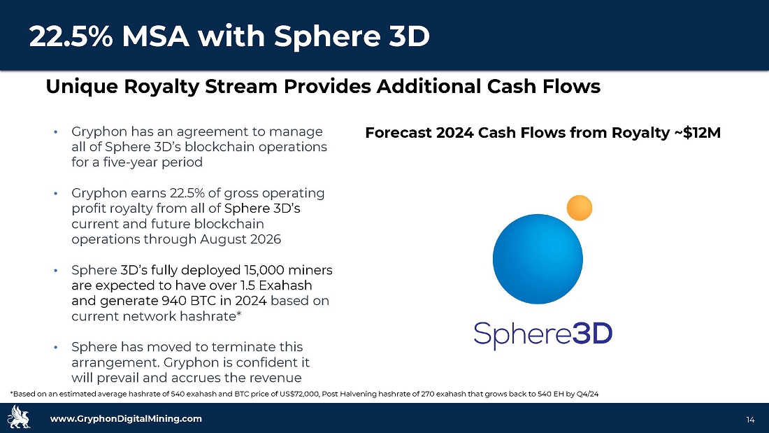www.GryphonDigitalMining.com Target Capitalization • Gryphon has spent only $42/TH to build its entire operation (machines, hosting, management, etc.) • Peer average Invested Capital Efficiency $156/TH** • Superior performance driven by unique royalty stream with a third - party miner, resourceful capital raising, disciplined capital deployment and asset light model 13 Gryphon outperforms peers in Invested Capital Efficiency* Industry Leader in Capital Efficiency *Invested Capital per terahash is defined as (Paid In Capital + Short - and Long - Term Debt + Short - and Long - Term Capital Leases – Liquid Assets) / Forecast hashrate that includes royalty stream ** Based on most recent publicly reported financial statements $42 $50 $70 $75 $92 $98 $104 $116 $167 $180 $210 $214 $156 $0 $50 $100 $150 $200 $250 Invested Capital ($)/TH IC/TH Average (ex-Gryphon)