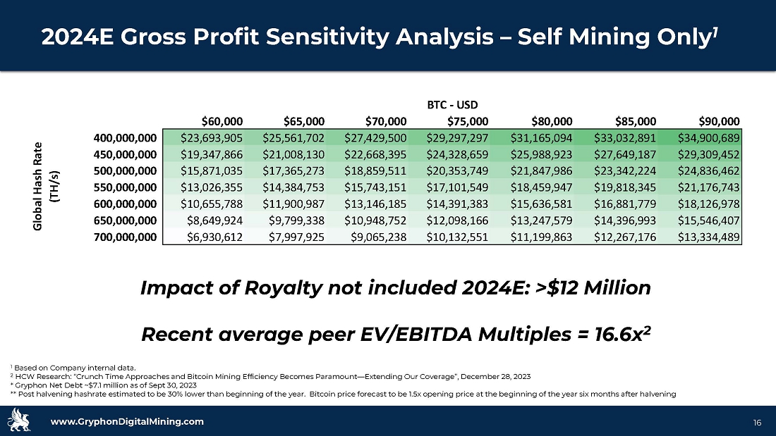www.GryphonDigitalMining.com Target Capitalization • Certified 100% renewable energy operation heading into 2024 • Gryphon Digital Mining was among a select inaugural group of 5 miners to be awarded a “ Green Proofs for Bitcoin” certification • Certifications were issued to Bitcoin miners based on their clean energy use and contributions to grid stability via demand response • Developed in partnership with over 35 miners, NGOs, grid operators, and other energy and crypto market participants, its approach to scoring is aligned with best practices for sustainability leadership and to approaches to corporate ESG reporting 15 Independently verified certification based on clean energy use Key Success Factor: Green Proofs for Bitcoin